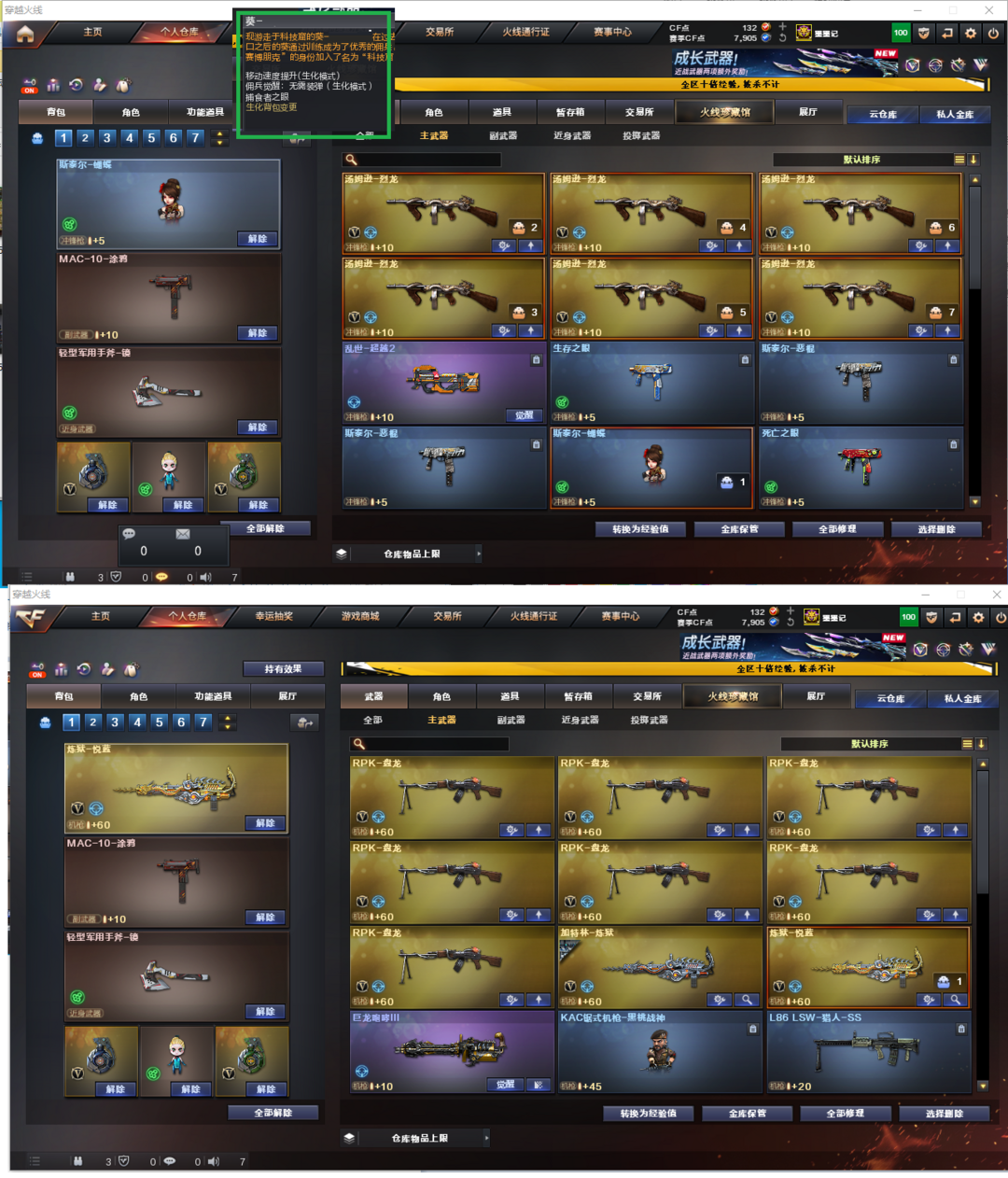 装备描述:排位:可以------------------ 生化四防极品(变更背包、可以查看生化僵尸血量):无需换弹、6烈6盘、传说圣灵、斯太尔蝴蝶、死亡之眼、 MAC-涂鸦、生化减速雷、超级对讲机、全部弹匣、、、、、爆破全四防:幻神2皮+音效(冠军之幻、AG冠军)、98K星神、王者幻神、M200-竞技荣光、、、USP雷暴、COP堕天神、COP雷霆王者、COP幻灵、竞技荣光柯尔特、荣耀世冠柯尔特、冠军之特、沙鹰幻兽、破空枪刃、、、、5套雷暴手雷、7套堕天神手雷、4套夜魔、7套幻灵、5套幻兽、、、、爆破四防(传说女帝、影豹、王者貂蝉、职业经理)、生化四防(葵-赛 博 朋 克、云悠悠)