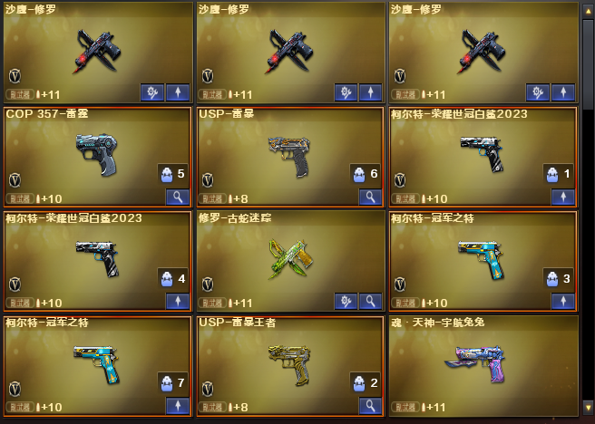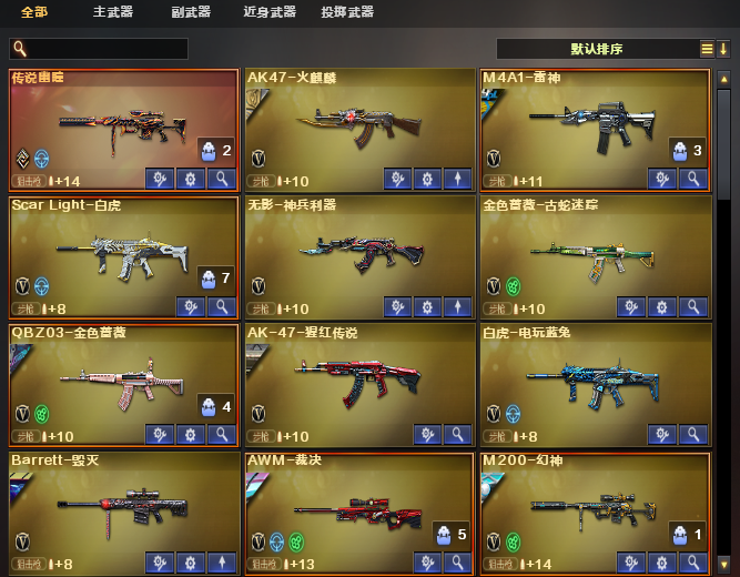 装备描述:王者武器:USP-雷暴王者;烟雾弹-雷暴王者;闪光弹-雷暴王者;高爆手雷-雷暴王者;炫金骑士;炫金修罗 英雄武器:屠龙;AK47-火麒麟;Barrett-毁灭;沙鹰-修罗;M4A1-雷神;M200-幻神;USP-雷暴;高爆手雷-雷暴;闪光弹-雷霆;擎天-竞技荣光;柯尔特-冠军之特;烟雾弹-竞技荣光;白虎-电玩蓝兔;闪光弹-竞技荣光;高爆手雷-竞技荣光;Scar Light-白虎;炽芒蝶刃;高爆手雷-神工天巧;闪光弹-神工天巧;唐刀-神工天巧;AK-47-猩红传说;无影-神兵利器;烟雾弹-神工天巧;Barrett-暗月传说;QBZ03-金色蔷薇;传说幽瞳;柯尔特-荣耀世冠白鲨2023;Kar98K-星神;AWM-裁决;雷霆之契;龙啸-烈火龙威 装饰品:雷神-暗月;炽芒蝶刃-荣耀世冠白鲨2023 皮肤;幻神-荣耀世冠白鲨2023 皮肤;雷神-耀金皮肤;火麒麟-大唐荣