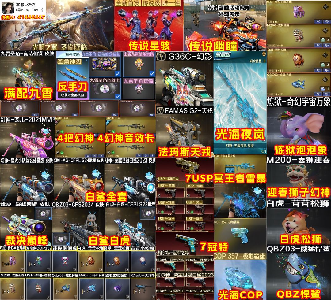 限制: 租号6次及以上 | 撤单率<50%才可租用此帐号装备描述:【装备道具】:传说艾莉莎/传说星骇/传说圣谕/传说幽瞳/传说幽冥★幻神-光海夜岚 皮肤/幻神-Heartshot/幻神-电流骇客/幻神-动感闪耀/幻神-星火小队签名臻藏版/幻神-AG-CFPL S24冠军/幻神-黄忠/M200-幻神-荣耀世冠白鲨/幻神-荣耀世冠白鲨2023/M200-幻神-N9-2022MVP/幻神-宠儿-2021MVP/幻神-周瑜/幻神-AG-CFPLS17冠军/幻神-CFS2022/星神-巅峰荣耀/98K-星神-冠军之星/星神-璀璨/裁决-典雅胡桃/裁决-流光秘银/裁决-百城联赛天津/裁决-凤灵/裁决-巅峰荣耀/白虎-白鲨冠军/白虎-暗星/白虎-巅峰荣耀/白虎-AG-CFPLS20冠军/QBZ-CFS2024/QBZ-AG冠军/QBZ-荣耀世冠白鲨/QBZ03-冠军之薇/世冠白鲨炽芒蝶刃-巅峰荣耀/炽芒蝶刃-冠军炽芒/FAMAS G2-天戎/九霄圣角/USP-冥王4把/USP-雷暴王者/圣角神刃/独角之刃/荣耀世冠-柯尔特/柯尔特-冠军之特/USP-雷暴/USP-神工天巧/白虎-茸茸松狮/QBZ03-威猛悍鲨/M200-喜狮迎春/炼狱-奇幻宇宙万象//斯泰尔-蝴蝶