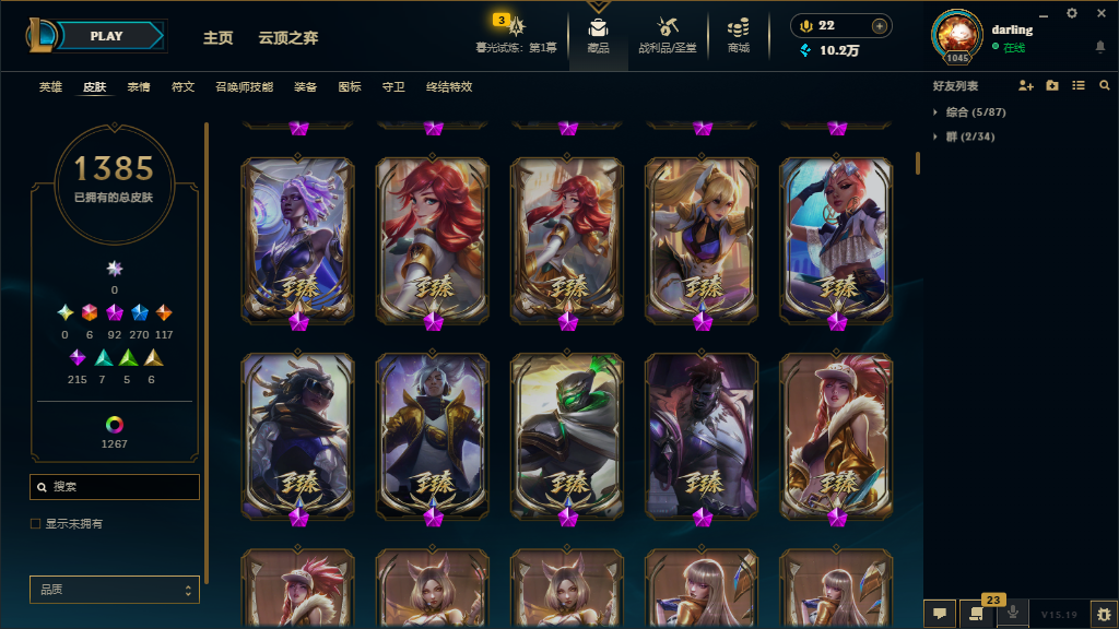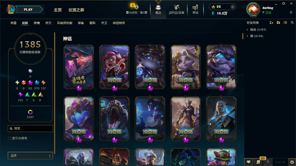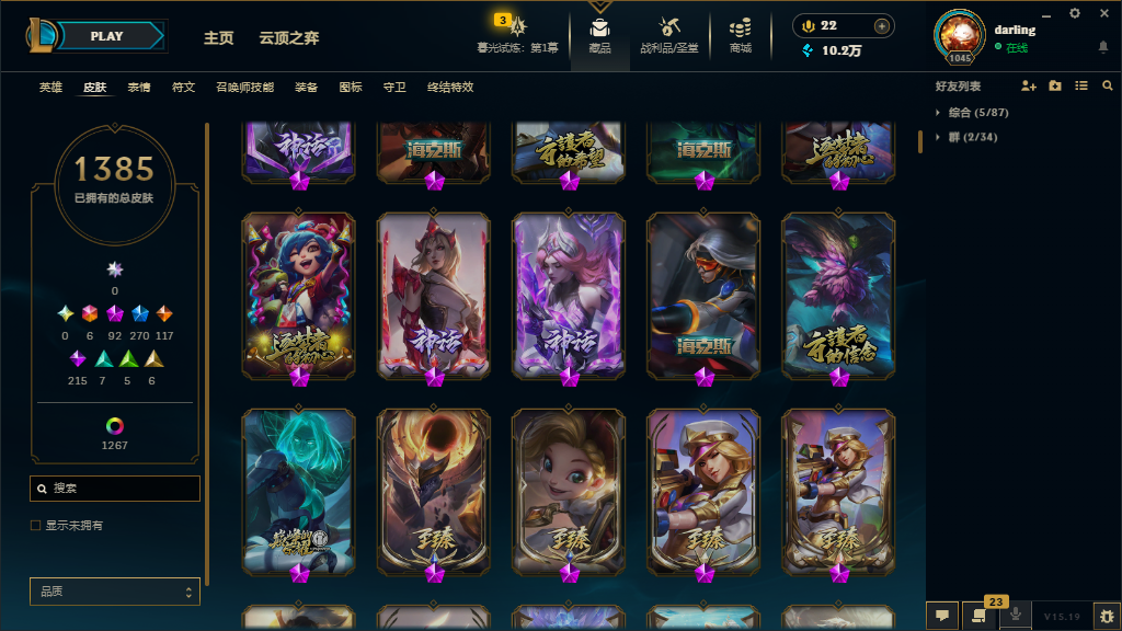可排位白银,皮肤3000,炫彩1319,臻彩67.终极6神话92限定270传说117史诗215