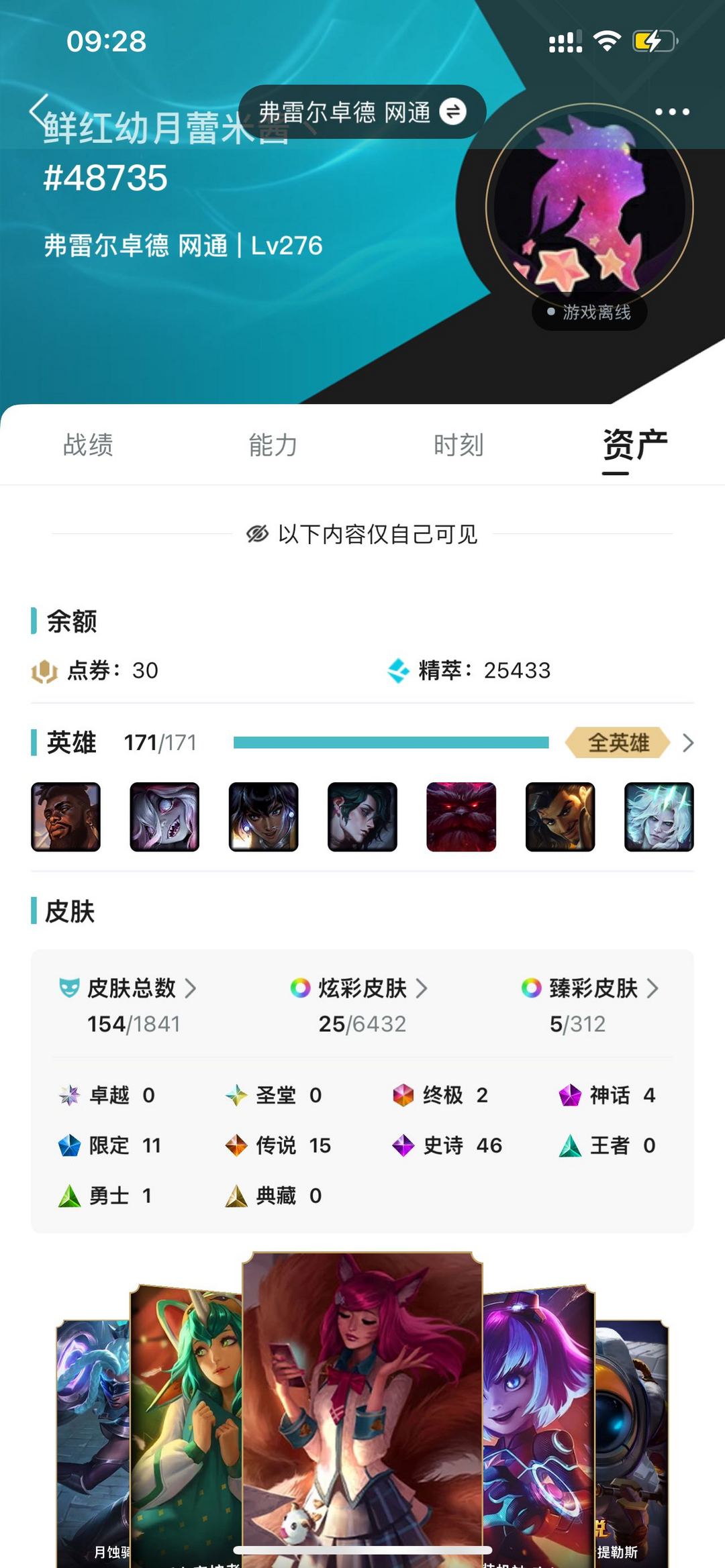 个人游戏号全英雄连续多个赛季无排位150+皮肤