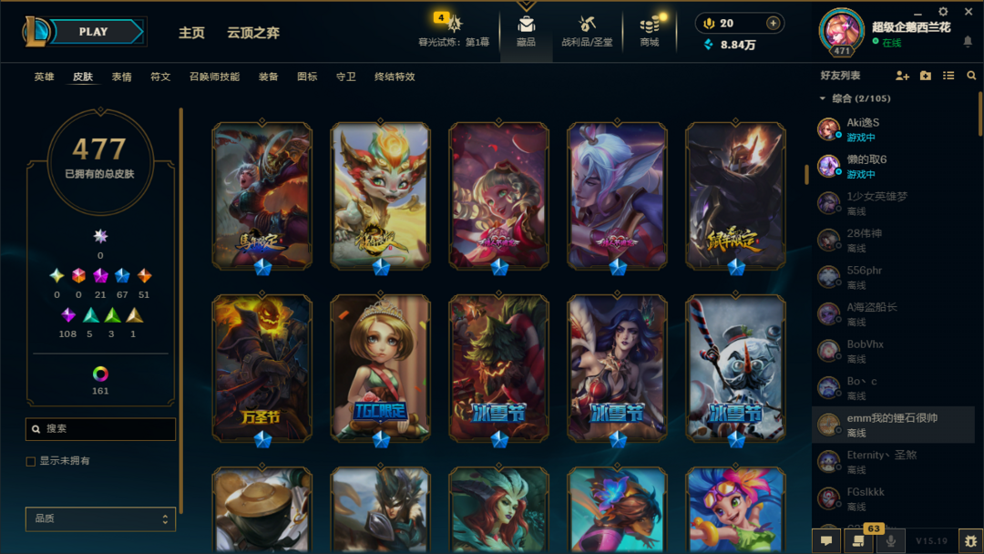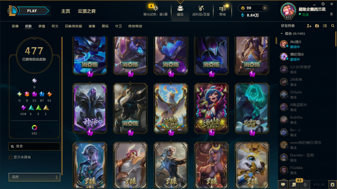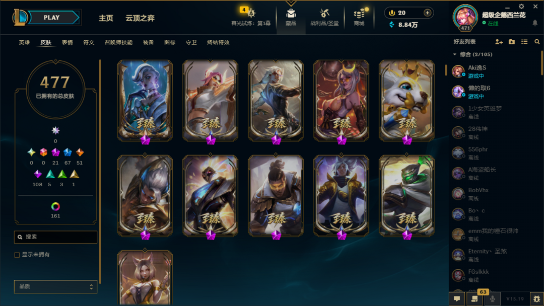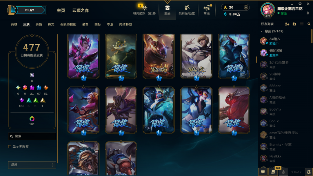 【艾欧尼亚】477皮★炫彩★臻彩★海克斯★段位实时★真实描述★