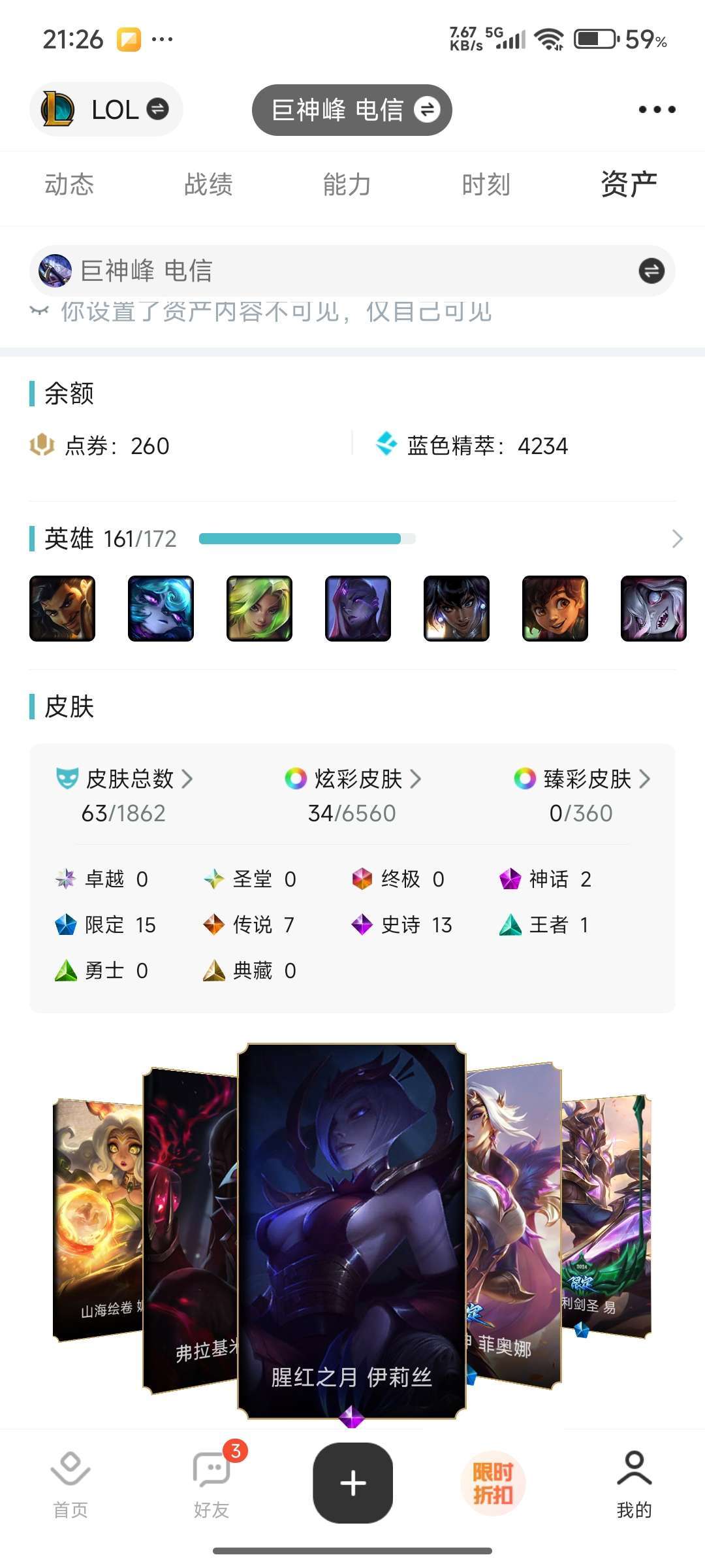 装备描述:63个皮肤全英雄盲僧熟练度高多个5级,可以玩盲神