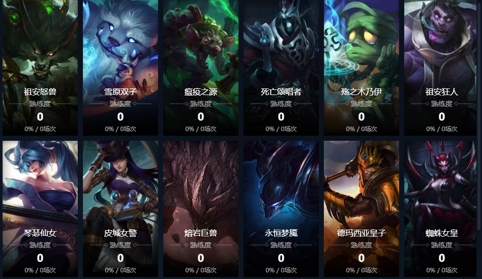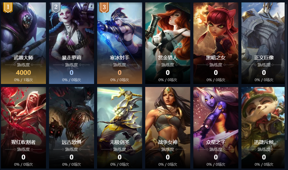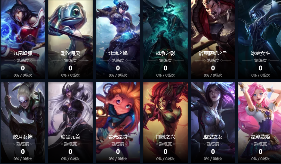 暴走萝莉;皮城女警;寒冰射手;黑暗之女;德邦总管;远古恐惧;无极剑圣;牛头酋长;亡灵战神;战争女神;