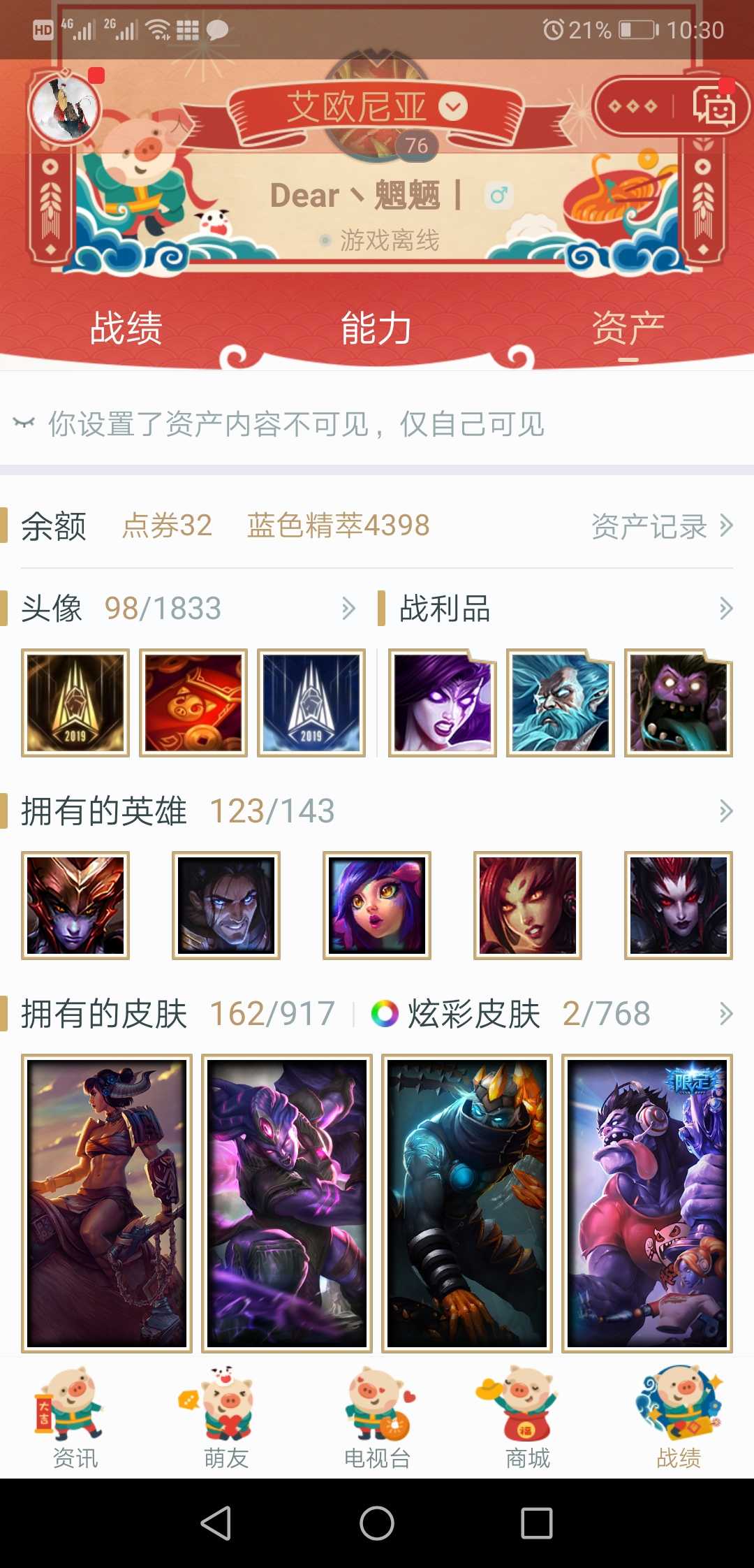 一区上赛季灵活组排黄金段位,英雄123个,皮肤164个
