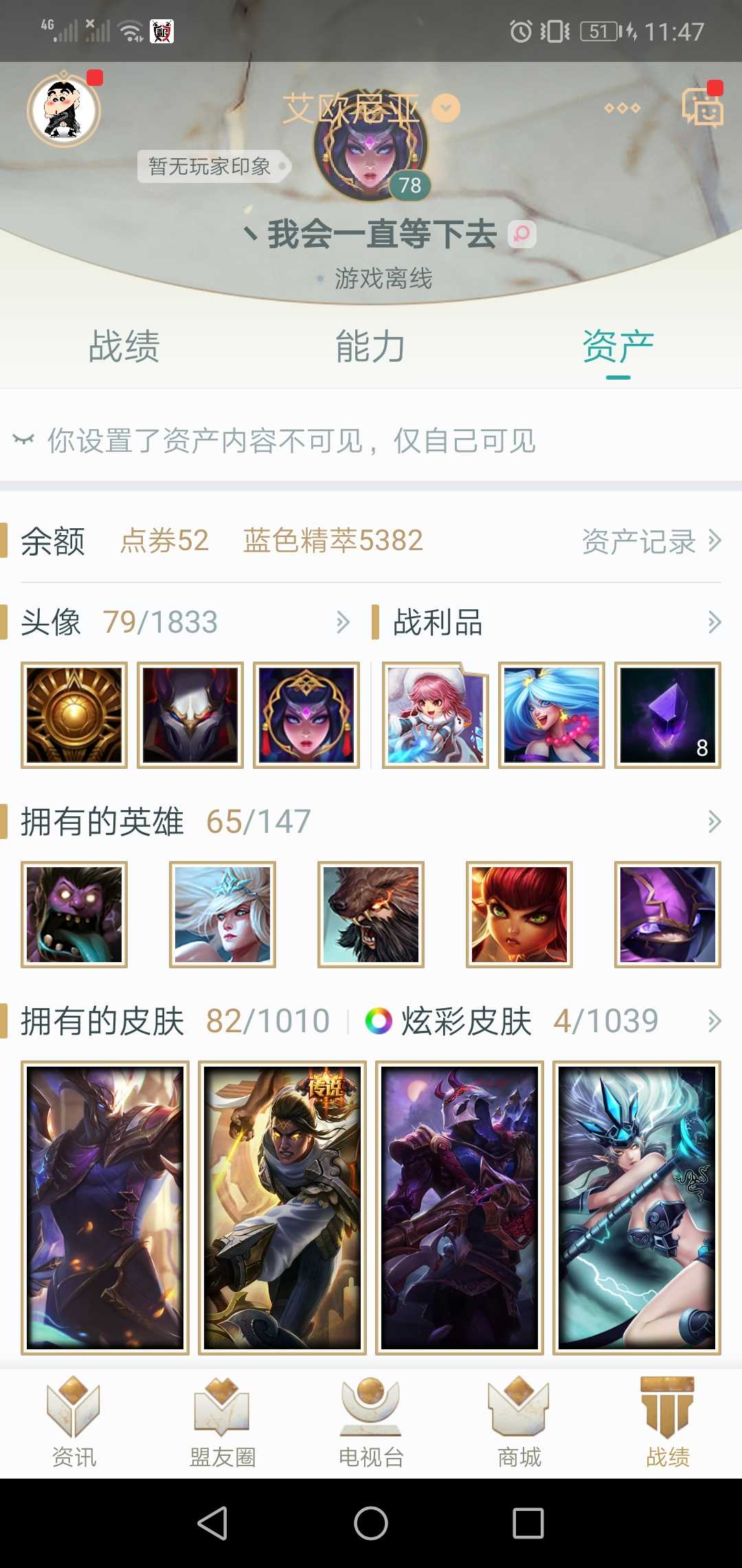 装备描述:电一艾欧尼亚65英雄82皮肤有炫彩,单双排黄金4,灵活没有打完。可排位