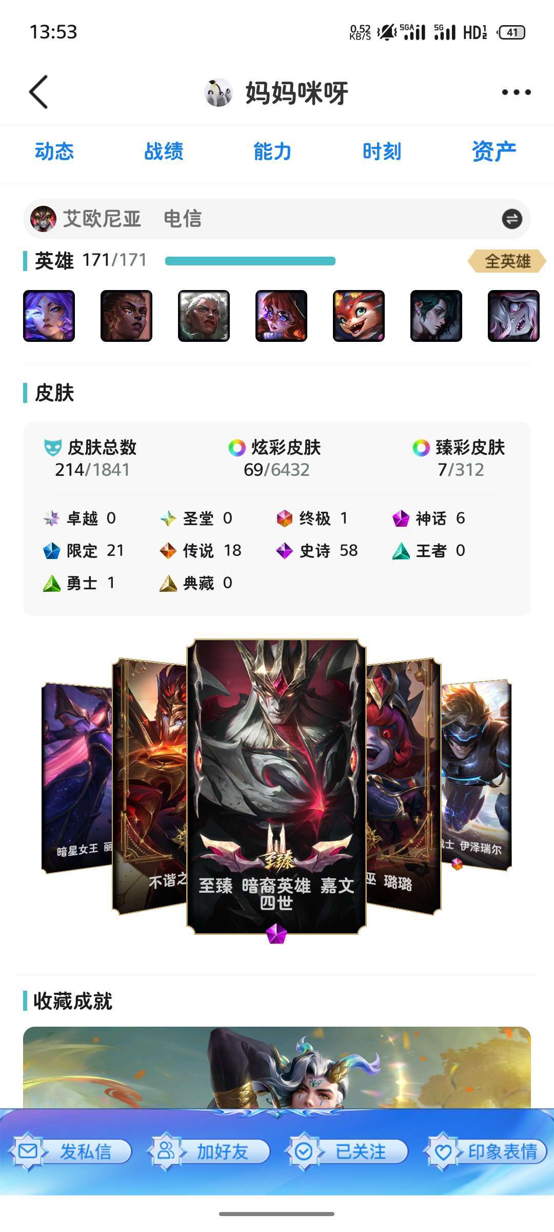 装备描述:艾欧里亚全英雄精品账号皮肤多质量高,开黑娱乐首选