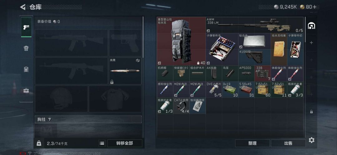百万哈夫币 9.5m现金仓库还有9m的装备这号爆率挺高,而且遇到的对手也很菜还有自选武器还有7发AW子弹,红包