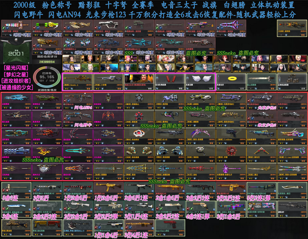 限制: 租号5次及以上 |装备描述:2025年09月,致命打击+极速飞奔已确定激活。【请勿使用账号芯片】 【有建议请您⑤星好评+留言,谢谢】 ★2000级,粉色称号,94%武器持有! ★绝版装饰:战旗、白翅膀、立体机动装置、巨人切割者、屠夫电音三太子皮肤! ★特典武器:黯影狙+歼星十字弩+日冕加特林。 ★全部武器全6攻6恢复,请您去仓库里自行切换! ★闪电AN94、闪电野牛、光束步枪123,全部拥有,轻松上分。 【玩过别忘收藏!!!用心打造极品账号,给您最棒的游戏体验!】