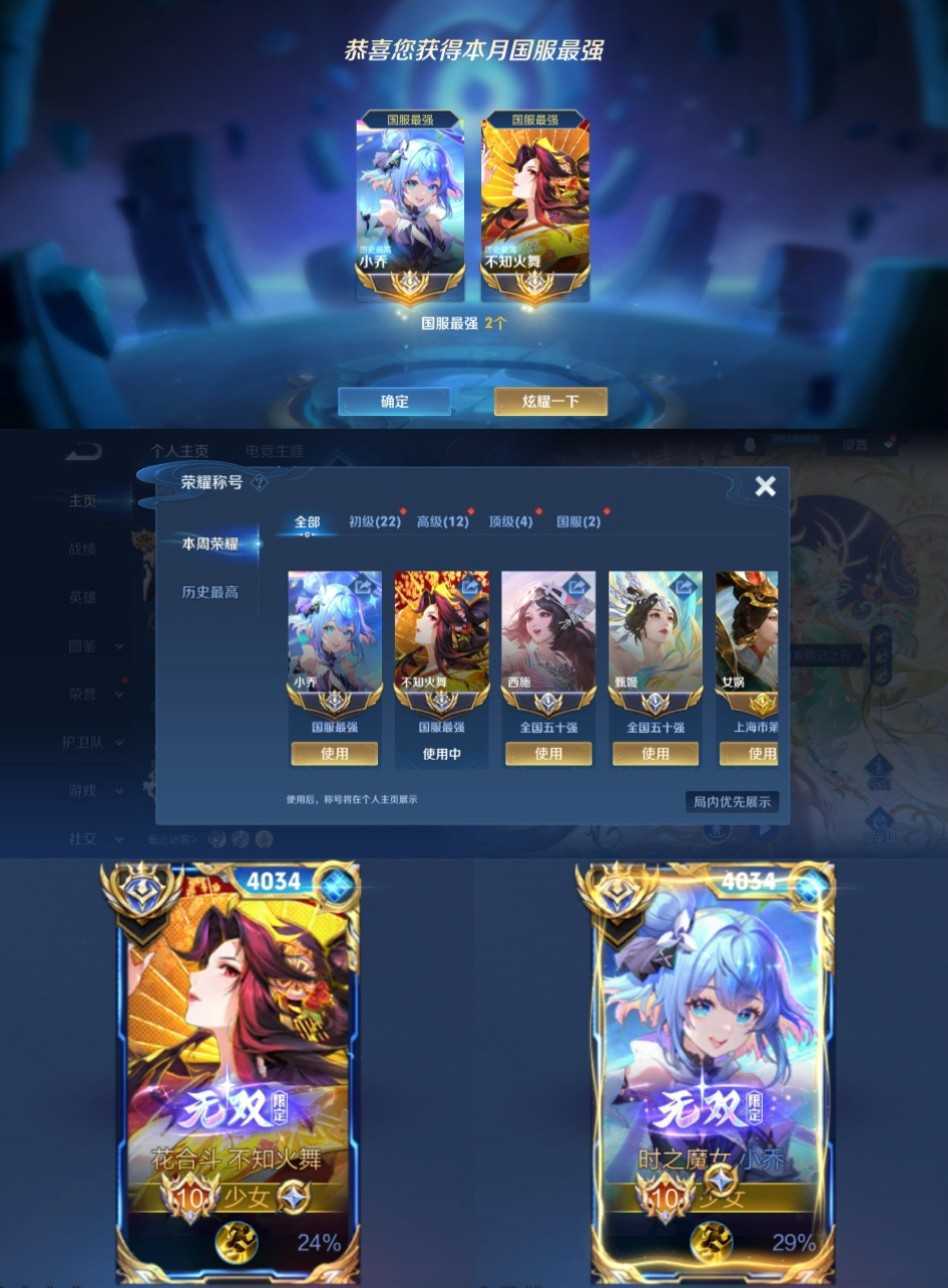 荣耀贵族十月在榜国服小乔火舞+小国标西施甄姬❤️巅峰万强框+女号+国服瑶少司缘海月杨玉环朵莉亚~