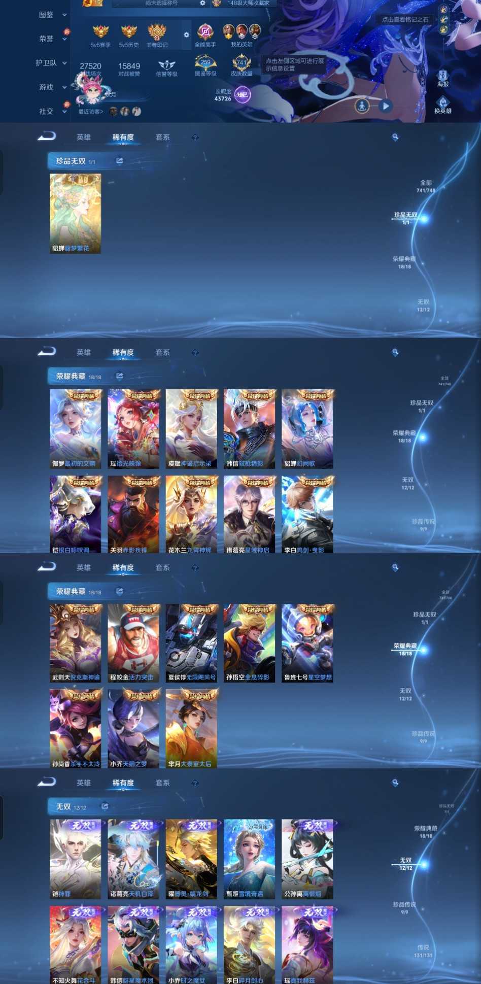 限制: 租号1次及以上 | 撤单率<49%才可租用此帐号装备描述:时间到了还登录白玩或者顶号全部改密拉黑处理永不解除,顶号机器会秒禁玩改密,顶号不仅拉黑还没得玩,赚三两块不容易,请理解谢谢。 ❤❤❤❤❤❤❤❤❤❤❤❤❤❤❤ 请勿开挂,挂机,送头,骂人,撤单后游戏等如有违规永久拉黑永不解除。重置二级密码不要费劲了,号主每天都会上号查看,多行不义必自毙,人在做天在看,多做好事多自律,少做缺德事。 该号英雄128个皮肤741个,珍品无双1个,典藏25个,无双12个,珍品传说9个,星传说10个,传说131个,史诗265个,祝你游戏愉快~