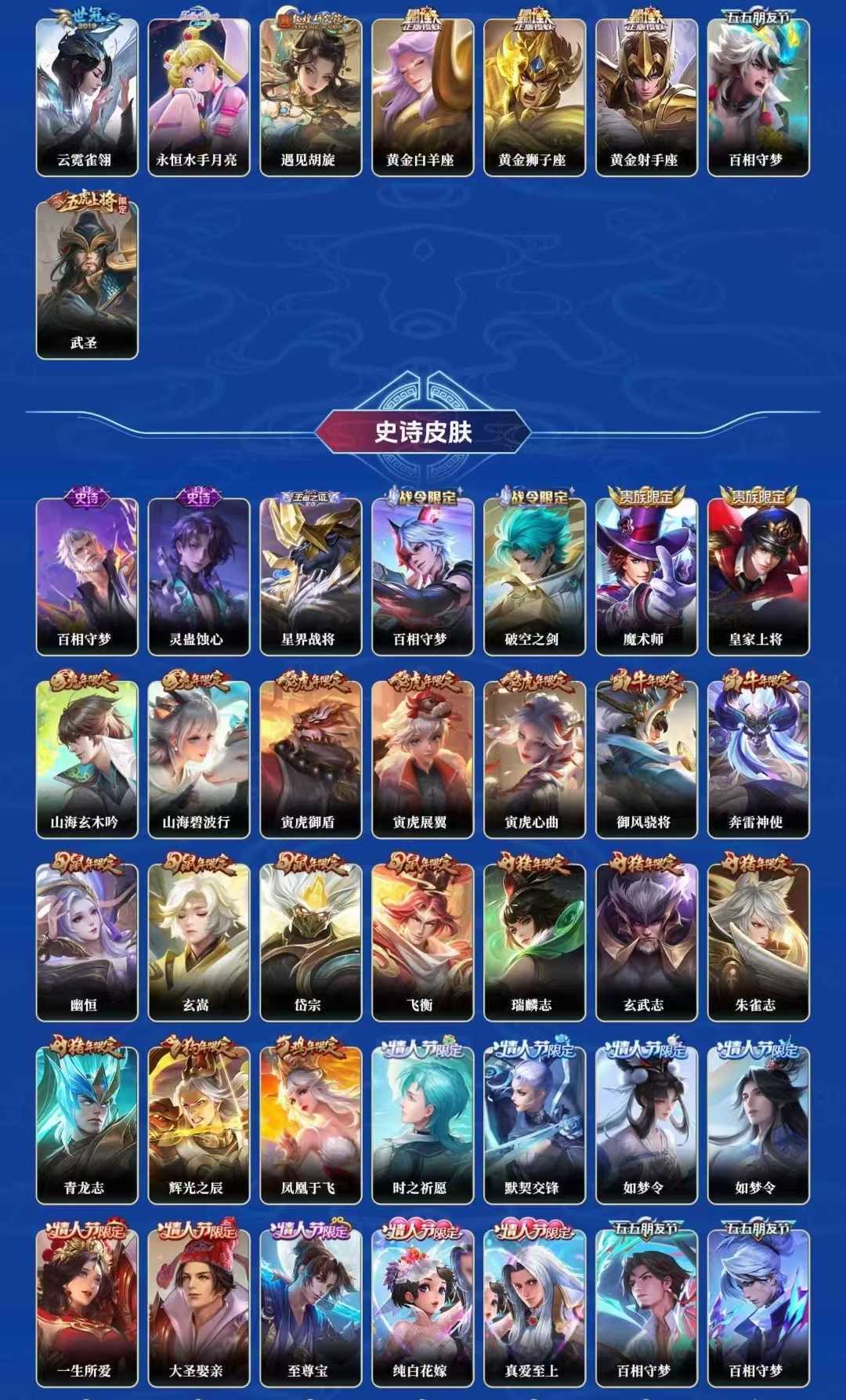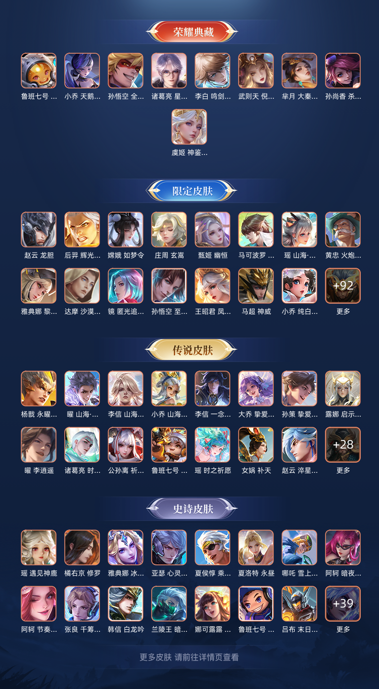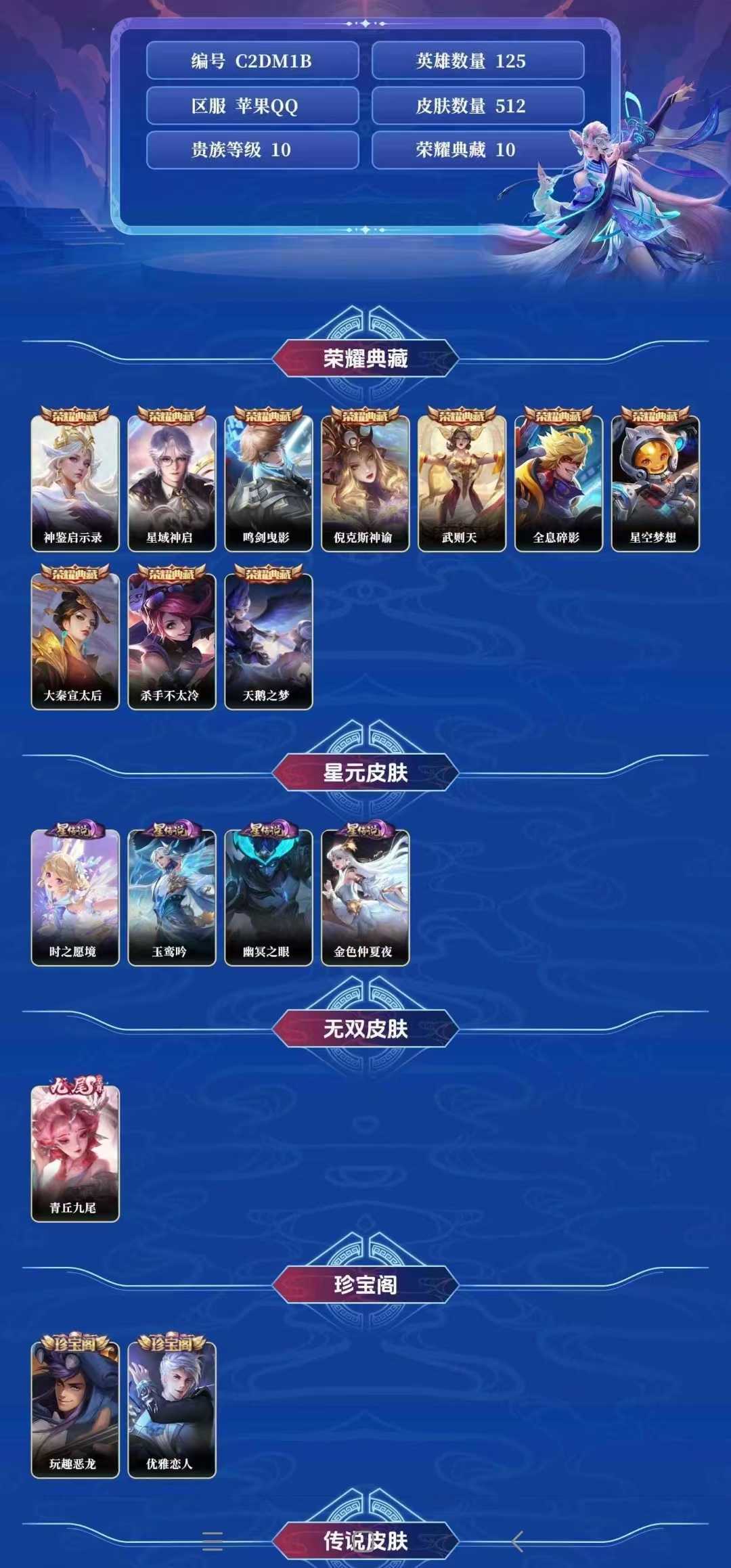 【C254】贵族V10~富婆女号512皮肤10水晶64传说1无双金标瑤青丘九尾,情瑶,神鉴启示录,倪