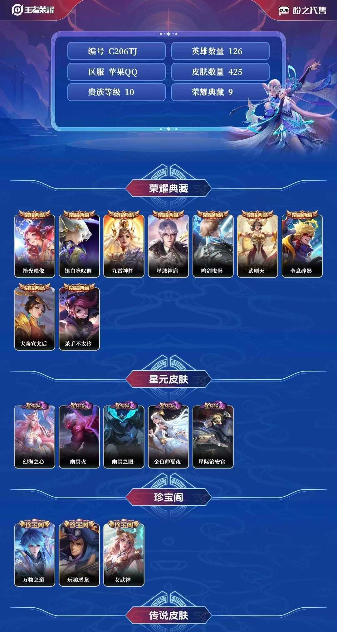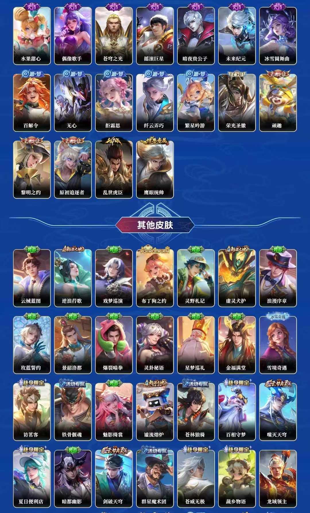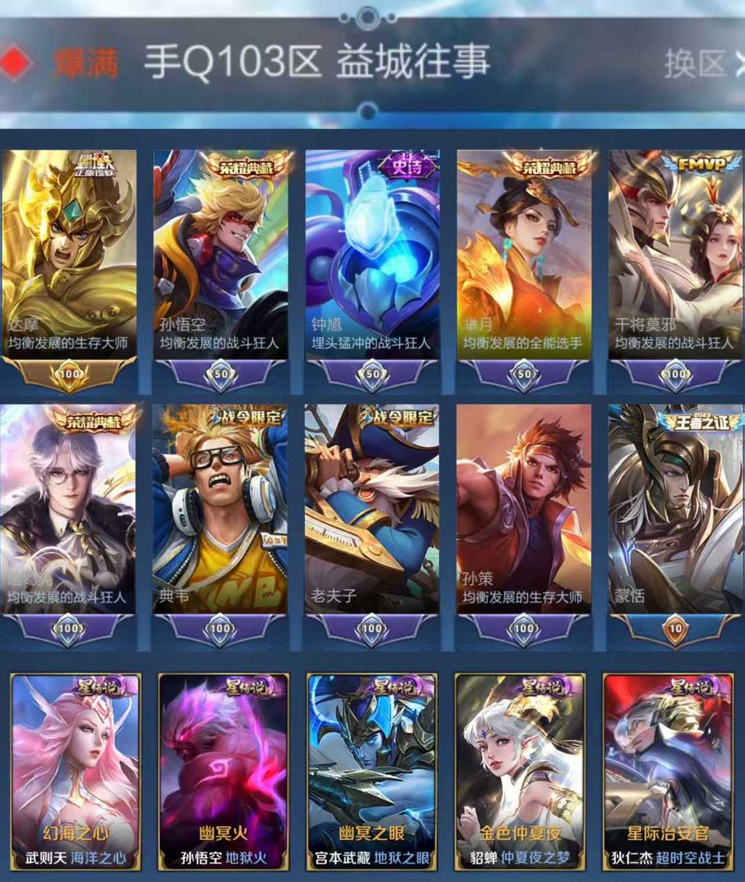 限制: 租号5次及以上 |装备描述:【C269】贵族V10~425皮肤满蛇年9水晶32传说瑶典藏时之映像,星之鸣奏,千劫归真,祥瑞亨通,情瑶,拾光映像,九霄神辉,银白咏叹调,星域神启,无双飞将,全息碎影,鸣剑曳影,大秦宣太后,杀手不太冷【全山海情兔年,全寅虎,全五虎上将,全牛年,全五兽】