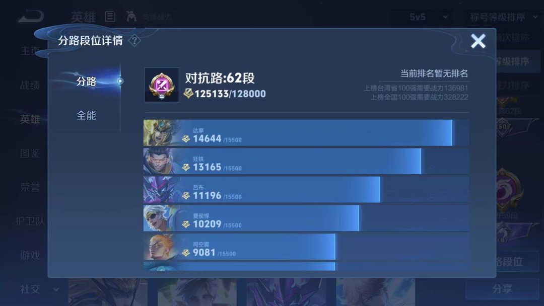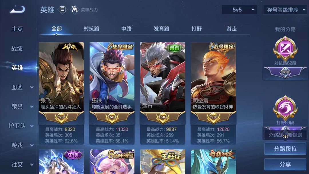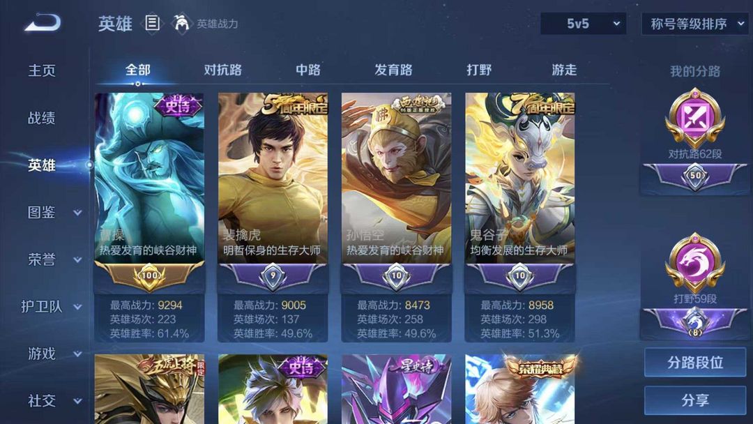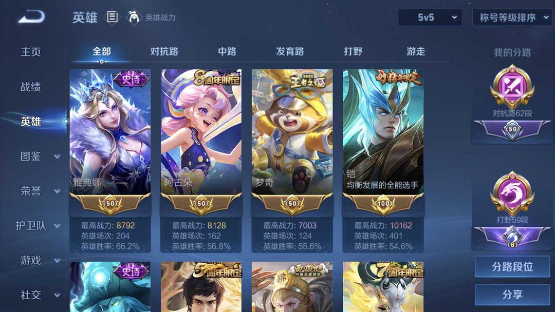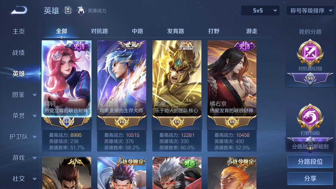 一小时起租⭐正式服小国阿轲⭐62段对抗路⭐59段打野⭐多万战省标⭐300+高质量皮⭐信誉分够可巅峰