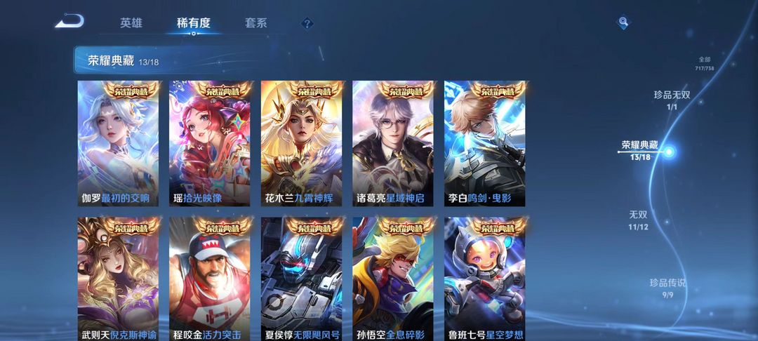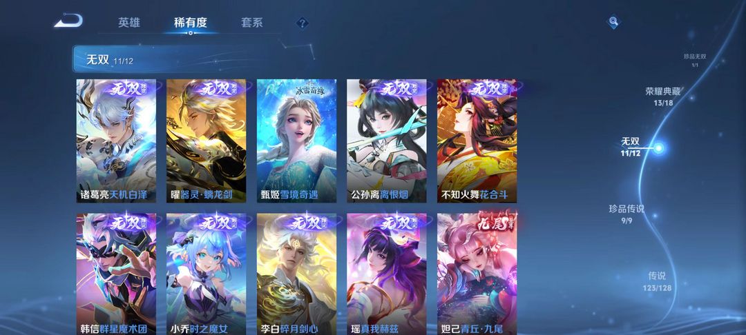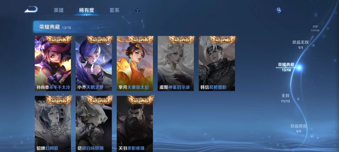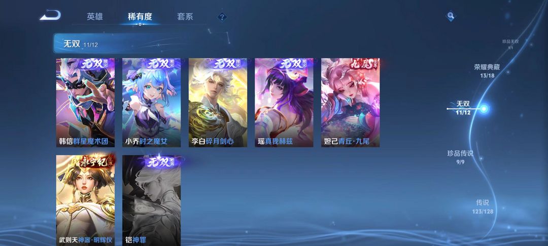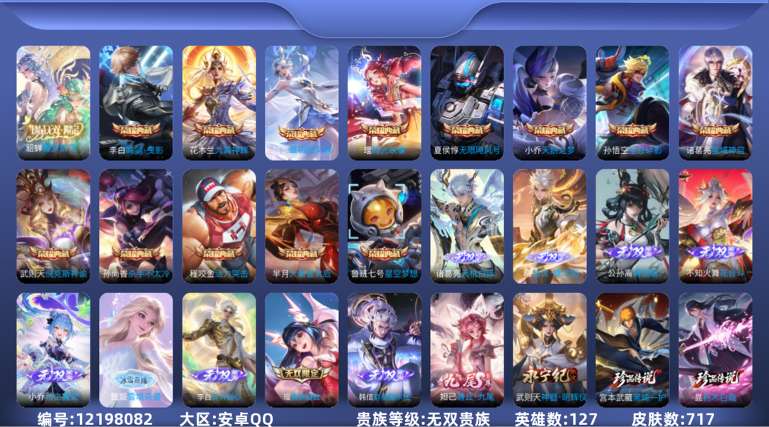 装备描述:4大国标裴擒虎1.8w 大国标杨玉环1.9w 大国标孙尚香1.8w 大国标西施1.6w武则天,天鹅之梦,星空梦想,倪克斯神谕,无限飓风号,活力突击,杀手不太冷,大秦宣太后,鸣剑·曳影,全息碎影,星域神启,九霄神辉,拾光映像,最初的交响 无双皮: 真我赫兹(瑶),神器·明辉仪,青丘·九尾,碎月剑心,小乔时之魔女,韩信群星魔术团,花合斗,离恨烟,雪境奇遇-甄姬,器灵·螭龙剑,天机白泽 珍品传说: 江户川柯南,怪盗基德,时之奇旅-孙策,器灵·落星盏,兔狲·蓬尾,酷洛米之心,大耳狗之梦,朽木白哉,黑崎一护 传说皮: 黄金狮子座,黄金射手座,冠军飞将,云鹰飞将,绛天战甲,黄金白羊座,猫影幻舞,久胜战神,炽阳神光,一念神魔,云霓雀翎,末日机甲-孙尚香,地狱火,仲夏夜之梦,音你心动-小乔,零号·赤焰,海洋之心,地狱之眼,飞鸢探春,音你心动-周瑜,胖达荣荣,李逍遥,乞巧织情,时之恋人-刘备,游龙清影,淬星耀世,超时空战士-狄仁杰,遇见胡旋,花朝如约,挚爱之约,挚爱花嫁,无双飞将,神器·狴犴令,神器·明辉仪,山海·炽霜斩,山海·琳琅生,山海·苍雷引,炽翼辉光,燃星之曲,画中仙,浮生妄,记忆之芯,百相守梦