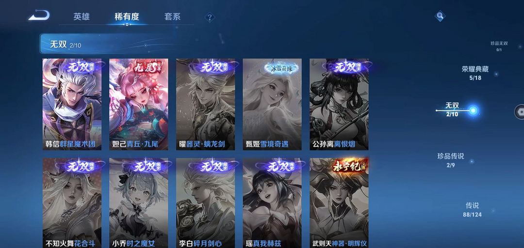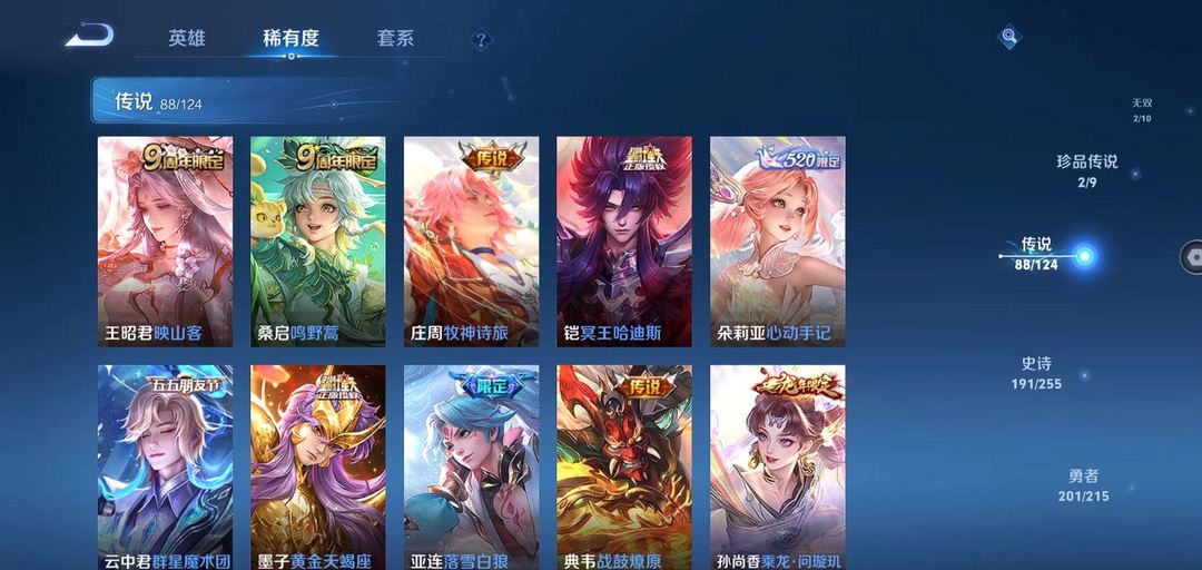 571皮肤5典藏 2珍品 2无双 88传说 2珍品杀手不太冷,九霄神辉,幻阙歌,神鉴启示录,最初的交