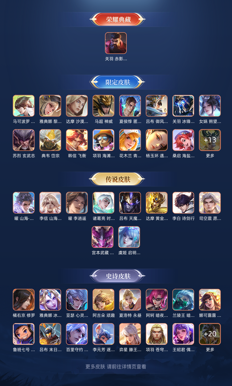装备描述:逍遥 ,曜 云鹰飞将,曜 归虚梦演);吕布(吕布 怒海麟威,吕布 御风骁将,吕布 末日机甲,吕布 野性能量,吕布 圣诞狂欢,吕布 猎兽之王,吕布 天魔缭乱);裴擒虎(裴擒虎 擒涛扼浪,裴擒虎 寅虎·赤拳,裴擒虎 李小龙,裴擒虎 街头旋风,裴擒虎 梅西);马可波罗(马可波罗 山海·玄木吟,马可波罗 潮玩牛仔,马可波罗 逐梦之星,马可波罗 暗影游猎,马可波罗 激情绿茵);夏侯惇(夏侯惇 匿光决锋者,夏侯惇 战争骑士,夏侯惇 无限飓风号,夏侯惇 朔风刀,夏侯惇 乘风破浪);李白(李白 范海辛,李白 敏锐之力,李白 鸣剑·曳影,李白 千年之狐,李白 凤求凰);花木兰(花木兰 九霄神辉,花木兰 瑞麟志,花木兰 青春决赛季,花木兰 默契交锋,花木兰 剑舞者,花木兰 水晶猎龙者,花木兰 冠军飞将,花木兰 兔女郎);貂蝉(貂蝉 幻阙歌,貂蝉 唤灵魅影,貂蝉 遇见胡旋,貂蝉 猫影幻舞,貂蝉 异域舞娘,貂蝉 仲夏夜之梦,貂蝉 圣诞恋歌);孙策(孙策 挚爱之约,孙策 末日机甲,孙策 猫狗日记,孙策 海之征途);杨戬(杨戬 潮玩骑兵,杨戬 天秀·启明,杨戬 次元傲视,杨戬 永曜之星,杨戬 埃及法老);宫本武藏