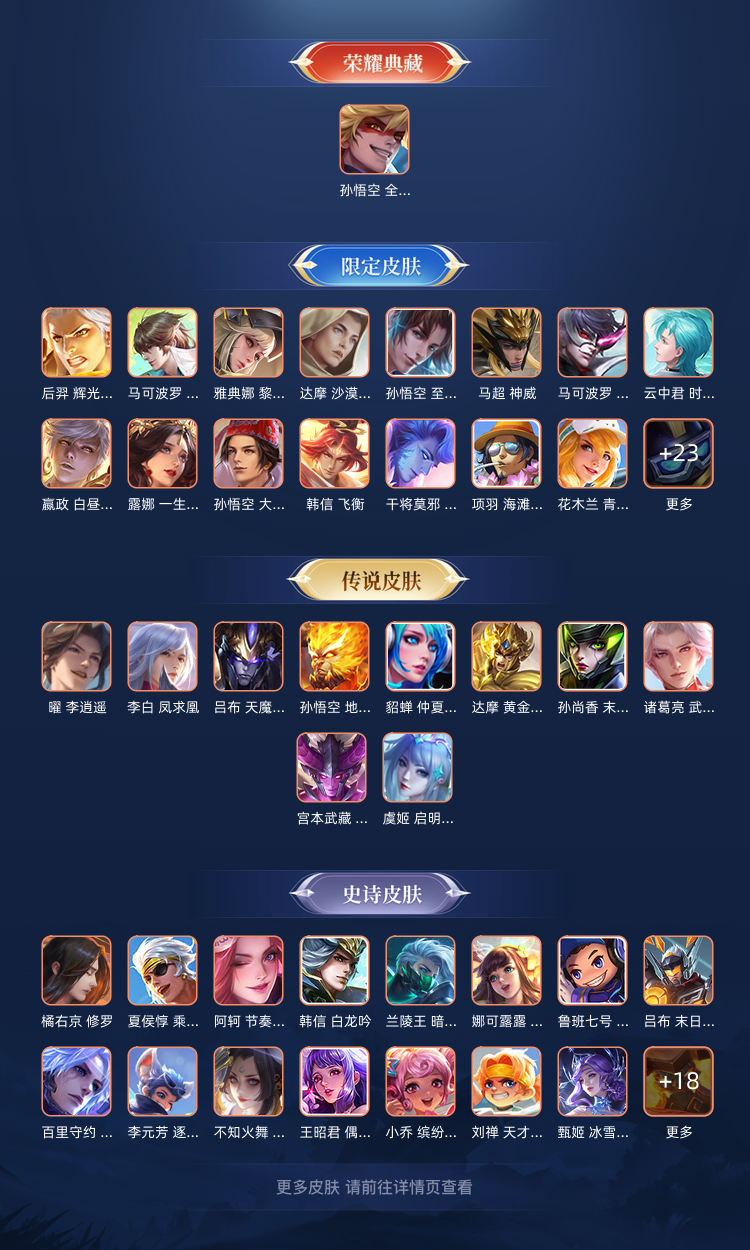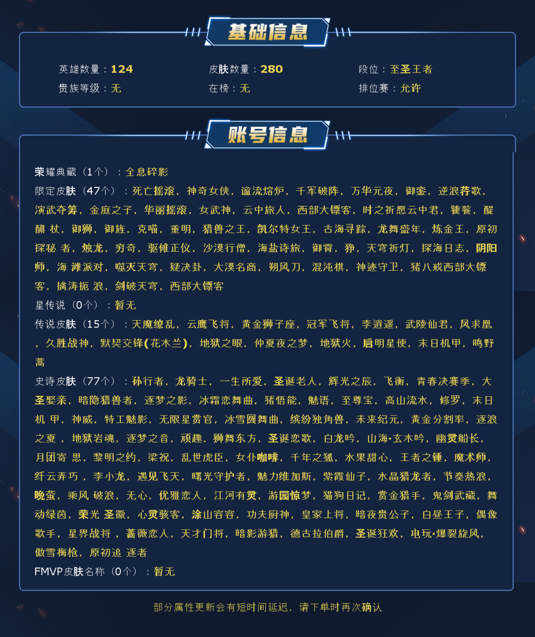 装备描述:贵族等级V1,英雄数量123,典藏皮肤数1,皮肤数量274,街头霸王天魔缭乱至尊宝圣诞老人王者之锤凤求凰逐梦之影武陵仙君神奇女侠黄金狮子座一生所爱全息碎影大圣娶亲冰霜恋舞曲久胜战神飞衡梁祝李逍遥孙行者神威傲雪梅枪