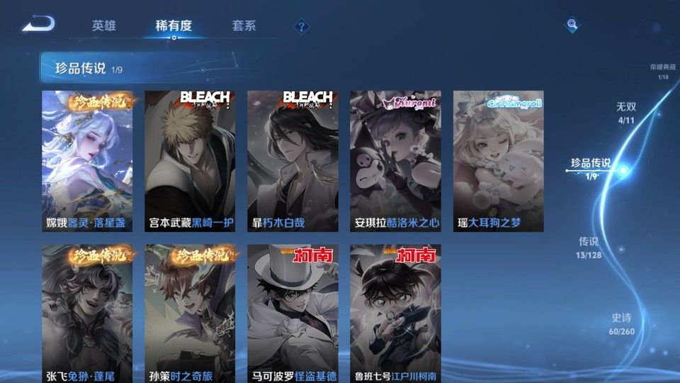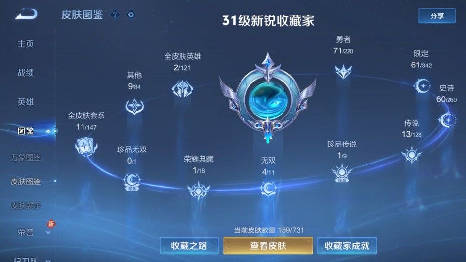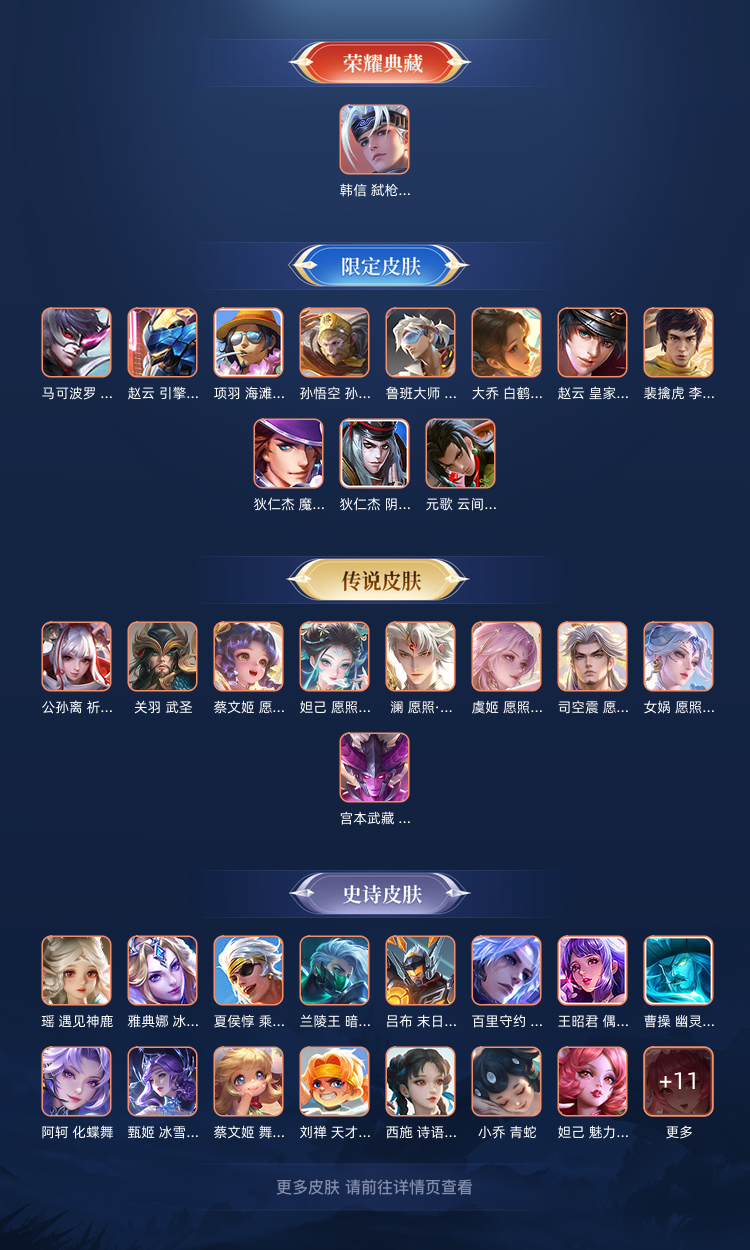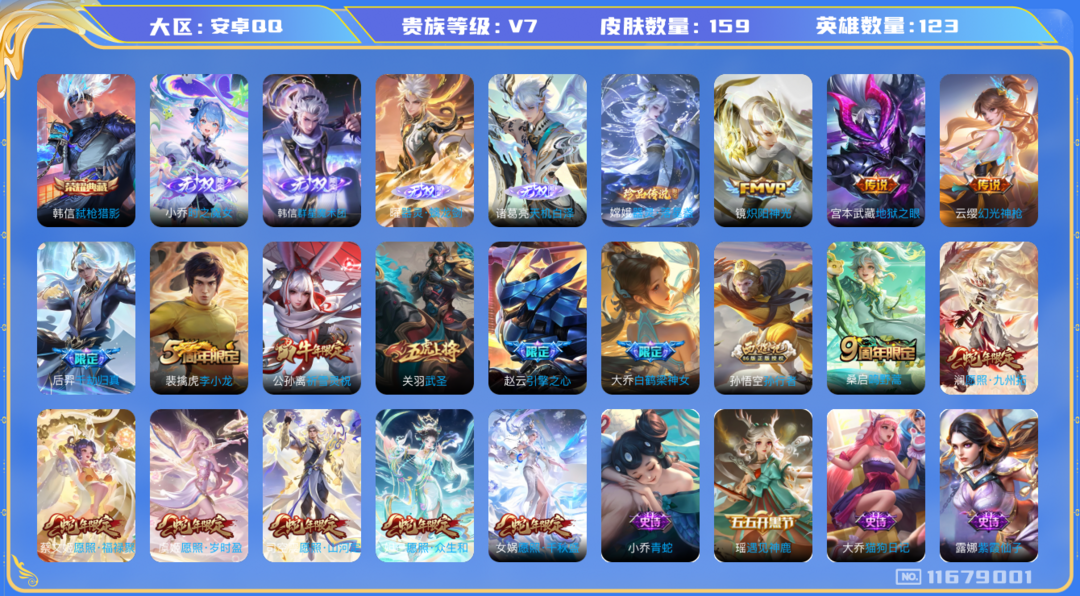 装备描述:贵族等级: V7 英雄数: 123 皮肤数: 159 荣耀水晶: 弑枪猎影 无双皮: 小乔时之魔女,韩信群星魔术团,器灵·螭龙剑,天机白泽 珍品传说: 器灵·落星盏 传说皮: 炽阳神光,地狱之眼,幻光神枪,千劫归真 限定皮: 李小龙,祈雪灵祝,引擎之心,白鹤梁神女,武圣,孙行者,鸣野蒿,愿照·千秋盛,愿照·众生和,愿照·山河定,愿照·岁时盈,愿照·福禄聚,愿照·九州拓