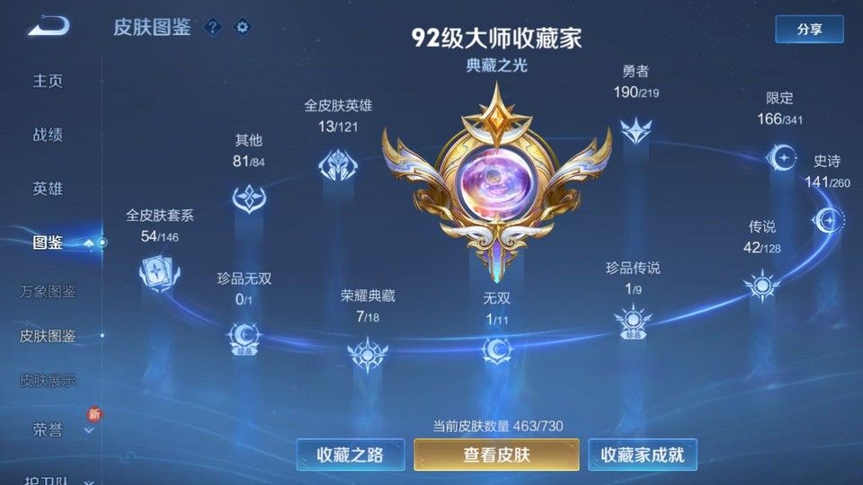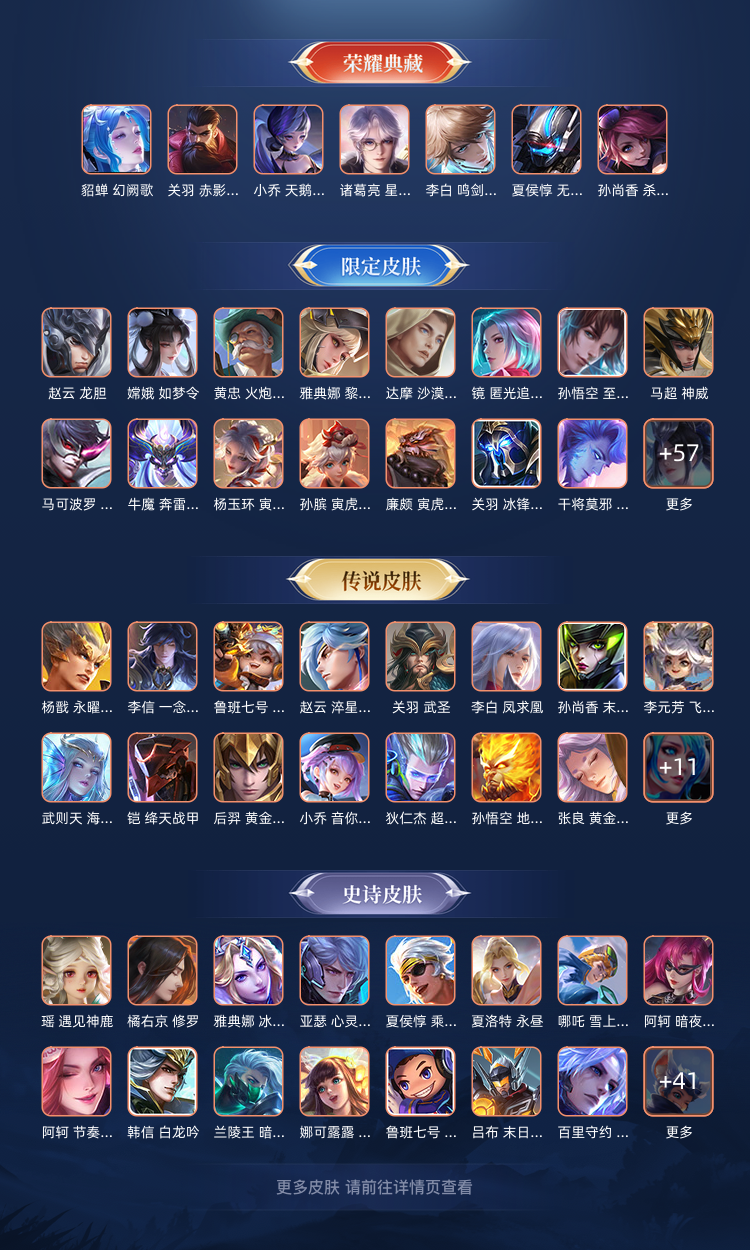 装备描述:贵族等级: V10 英雄数: 126 皮肤数: 463 荣耀水晶: 武则天,天鹅之梦,无限飓风号,杀手不太冷,鸣剑·曳影,星域神启,赤影疾锋,幻阙歌 无双皮: 青丘·九尾 珍品传说: 器灵·落星盏 传说皮: 黄金射手座,冠军飞将,云鹰飞将,绛天战甲,黄金白羊座,猫影幻舞,久胜战神,炽阳神光,一念神魔,末日机甲-孙尚香,地狱火,仲夏夜之梦,音你心动-小乔,海洋之心,地狱之眼,飞鸢探春,胖达荣荣,乞巧织情,时之恋人-刘备,游龙清影,淬星耀世,超时空战士-狄仁杰,青丘·九尾,永恒水手月亮,艾琳觅芳踪,乘龙·淬吴钩,幻光神枪,千劫归真 限定皮: 冰锋战神,遇见飞天,李小龙,奔雷神使,游园惊梦,梁祝,龙胆,武圣,异界灵契,白晶晶,天狼溯光者,神威,永曜之星,飞衡,天狼征服者,天狼狩猎者,冰霜恋舞曲,逐梦之星,逐梦之影,天狼绘梦者,凤求凰,寅虎·御盾,白虎志,朱雀志,如梦令-嫦娥,至尊宝,一生所爱,武陵仙君,大圣娶亲,寅虎·瑞焰,高山流水,孙行者,猪悟能,匿光追影者,女儿国国王,傲雪梅枪,寅虎·赤拳,寅虎·心曲,寅虎·展翼,五谷丰年,冰霜神祇,愿照·千秋盛,愿照·众生和,愿照·山河定,愿照·岁时盈
