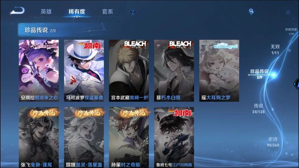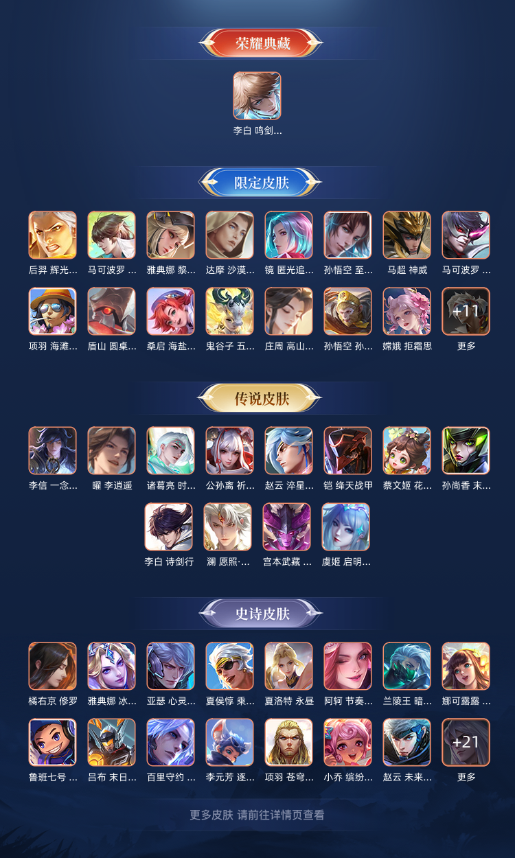装备描述:打野51段 金标澜 金标宫本武藏 金标李白 1典藏1无双2珍品24传说鸣剑·曳影 无双皮: 碎月剑心 珍品传说: 怪盗基德,酷洛米之心 传说皮: 云鹰飞将,绛天战甲,炽阳神光,一念神魔,末日机甲-孙尚香,地狱之眼,李逍遥,时之恋人-刘备,淬星耀世,花朝如约,电玩·雷克斯,鹤羽星尊,惊梅引,霜月吟,澜逐花归海,幻光神枪,祥瑞亨通,云诺千山 限定皮: 李小龙,祈雪灵祝,梁祝,时雨天司,辉光之辰,神威,至尊宝,默契交锋-花木兰,高山流水,孙行者,匿光追影者,傲雪梅枪,玉兔公主,五谷丰年,诗剑行,山海·玄木吟,鸣野蒿,逐霄战戟,愿照·九州拓