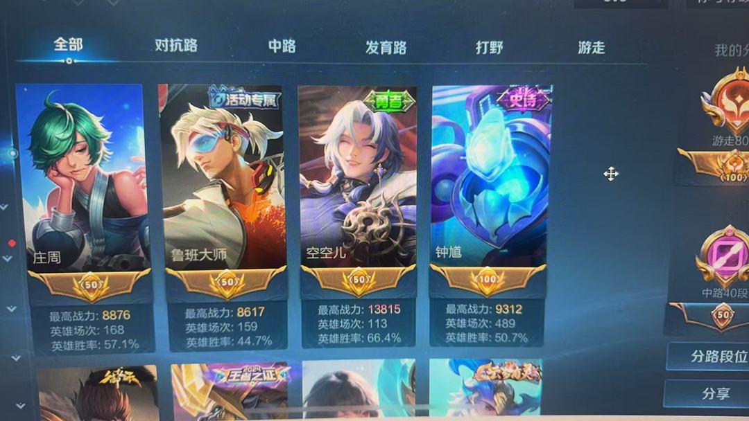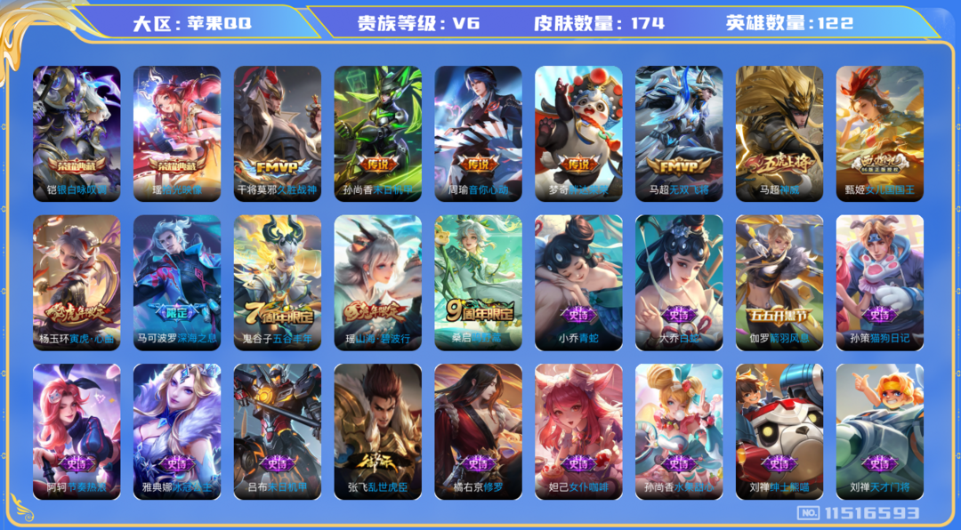 装备描述:80段辅助1.59w小国太乙真人1.36w小国廉颇1.39w省标杨玉环1.38w省标空空儿1.28w省标桑启魔方亮 贵族等级: V6 英雄数: 122 皮肤数: 174 荣耀水晶: 银白咏叹调,拾光映像 传说皮: 久胜战神,末日机甲-孙尚香,音你心动-周瑜,胖达荣荣,无双飞将 限定皮: 神威,女儿国国王,寅虎·心曲,深海之息,五谷丰年,山海·碧波行,鸣野蒿