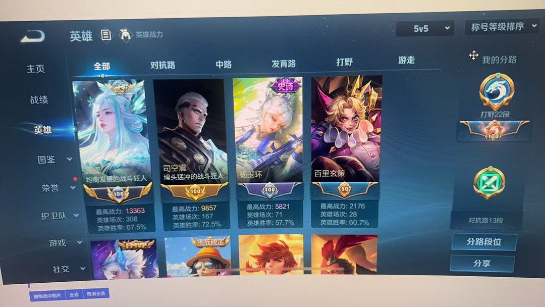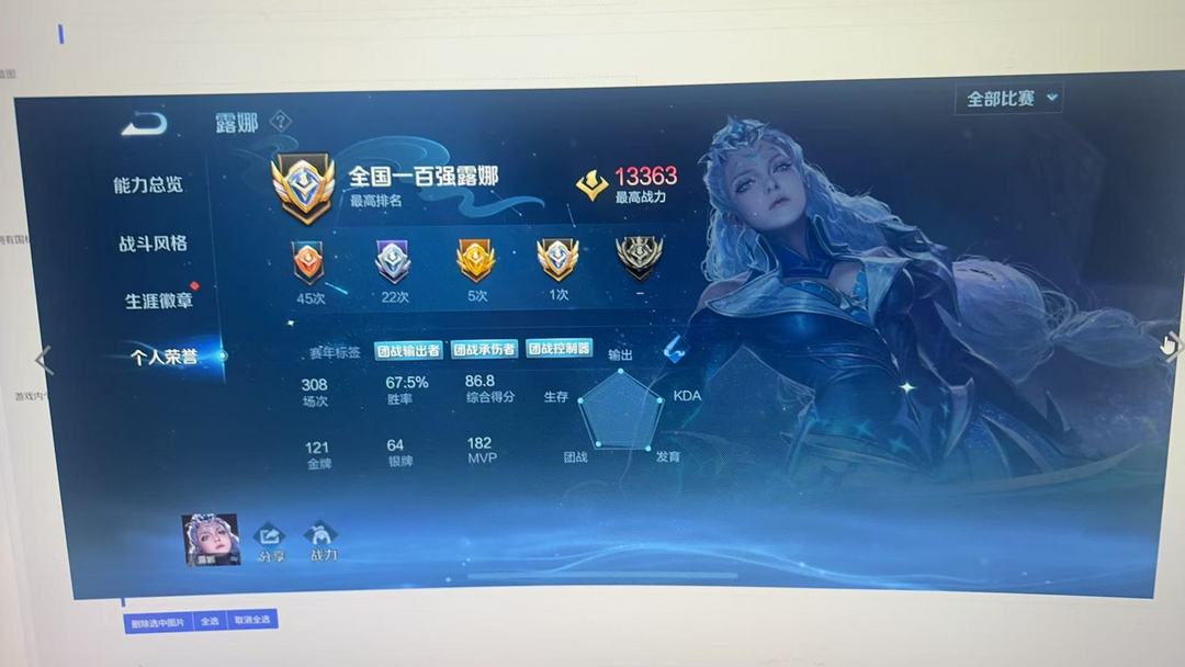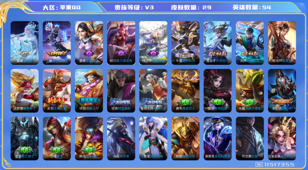 装备描述:1.33w小国露娜万战省标司空震 男号 贵族等级: V3 英雄数: 54 皮肤数: 29 传说皮: 霜月吟,澜逐花归海