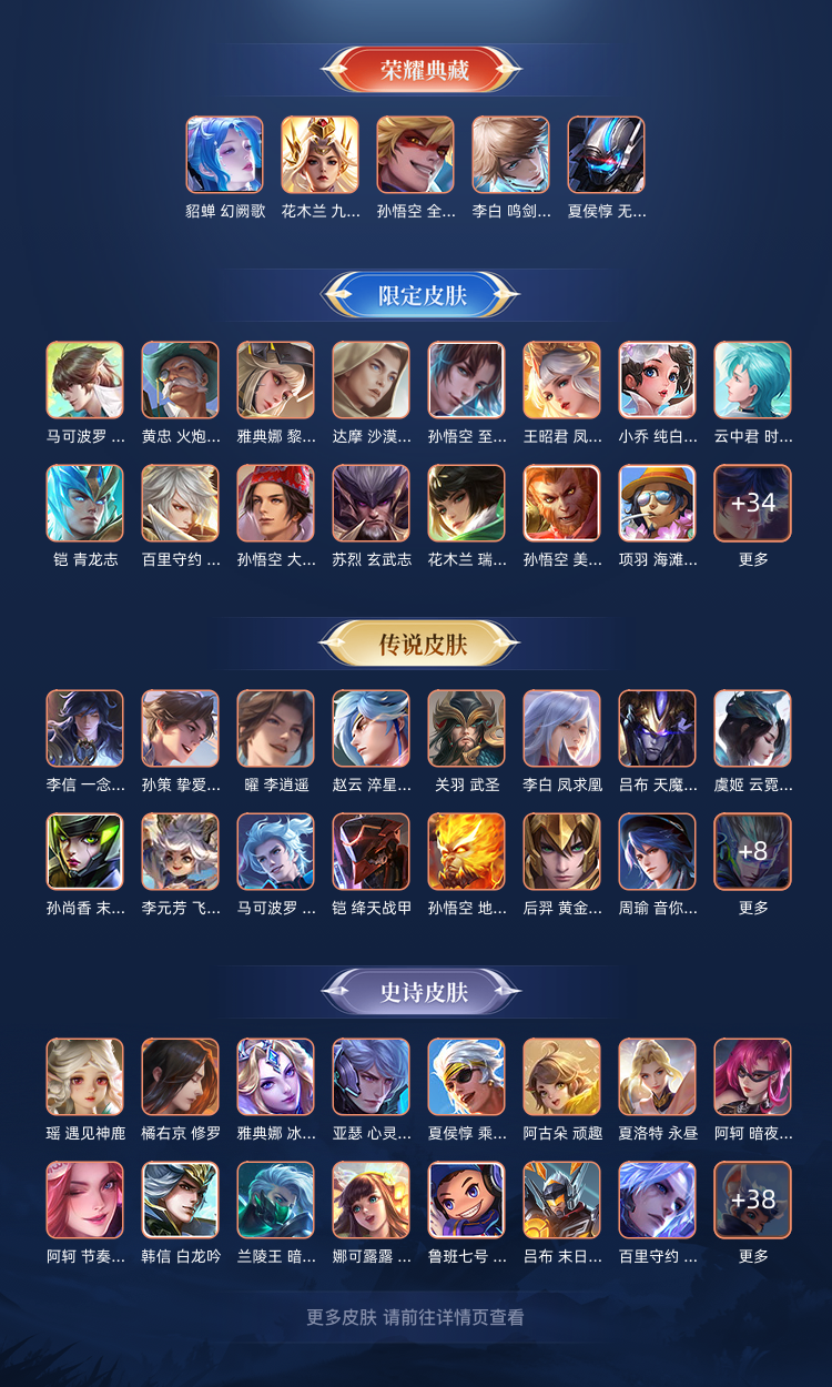 装备描述:无限飓风号,鸣剑·曳影,全息碎影,九霄神辉,幻阙歌 无双皮: 青丘·九尾 传说皮: 黄金射手座,云鹰飞将,绛天战甲,猫影幻舞,久胜战神,炽阳神光,一念神魔,云霓雀翎,末日机甲-孙尚香,地狱火,仲夏夜之梦,地狱之眼,飞鸢探春,音你心动-周瑜,胖达荣荣,李逍遥,乞巧织情,时之恋人-刘备,淬星耀世,超时空战士-狄仁杰,遇见胡旋,末日机甲-孙策,挚爱之约,碎云,浮生妄,记忆之芯,百相守梦(张飞),鹤羽星尊,惊梅引,艾琳觅芳踪 限定皮: 遇见飞天,李小龙,游园惊梦,梁祝,云端筑梦师,武圣,天魔缭乱,逐梦之音,逐梦之影,凤求凰,美猴王,青龙志,瑞麟志,玄武志,朱雀志,凤凰于飞,纯白花嫁,至尊宝,如梦令-后羿,大圣娶亲,高山流水,圣诞老人,孙行者,傲雪梅枪,时之祈愿-云中君,深海之息,前尘镜,匿光启智者,诗剑行,山海·玄木吟