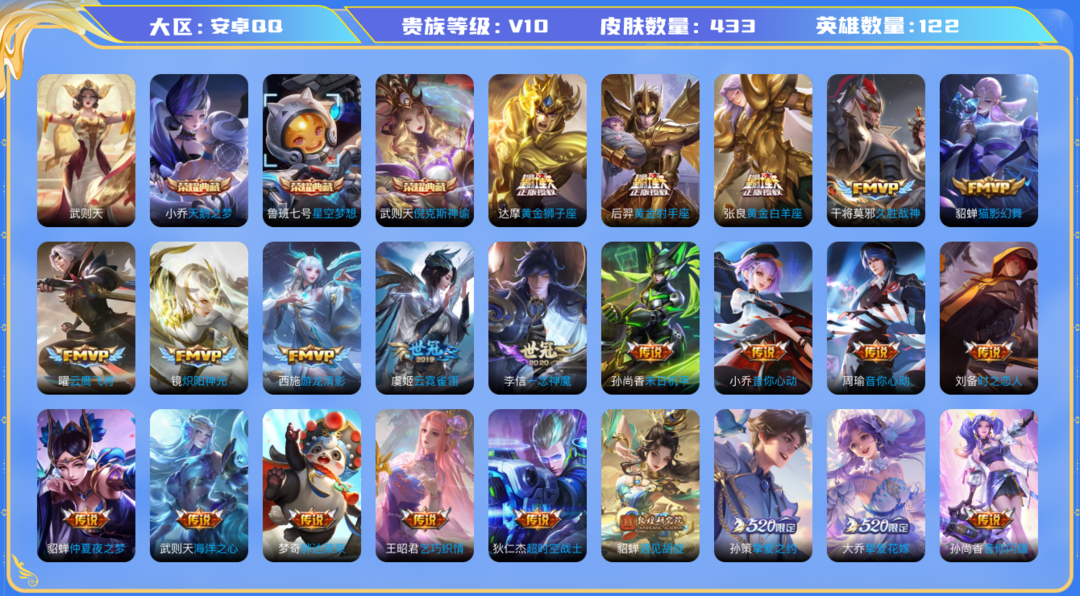 装备描述:英雄:诸葛亮(诸葛亮 星航指挥官,诸葛亮 时雨天司,诸葛亮 掌控之力,诸葛亮 黄金分割率);孙悟空(孙悟空 美猴王,孙悟空 孙行者,孙悟空 至尊宝,孙悟空 大圣娶亲,孙悟空 西部大镖客);马可波罗(马可波罗 山海·玄木吟,马可波罗 潮玩牛仔,马可波罗 暗影游猎,马可波罗 激情绿茵);吕布(吕布 天魔缭乱,吕布 野性能量,吕布 末日机甲,吕布 御风骁将,吕布 圣诞狂欢,吕布 猎兽之王);裴擒虎(裴擒虎 擒涛扼浪,裴擒虎 寅虎·赤拳,裴擒虎 李小龙,裴擒虎 梅西,裴擒虎 街头旋风);艾琳(艾琳 觅芳踪,艾琳 奇遇舞章,艾琳 女武神);小乔(小乔 山海·琳琅生,小乔 青蛇,小乔 纯白花嫁,小乔 万圣前夜,小乔 天鹅之梦,小乔 音你心动,小乔 丁香结,小乔 缤纷独角兽);瑶(瑶 山海·碧波行,瑶 时之祈愿,瑶 遇见神鹿,瑶 森);百里玄策(百里玄策 白虎志,百里玄策 原初追逐者,百里玄策 威尼斯狂欢);孙尚香(孙尚香 音你闪耀,孙尚香 异界灵契,孙尚香 水果甜心,孙尚香 时之恋人,孙尚香 蔷薇恋人,孙尚香 末日机甲,孙尚香 沉稳之力);干将莫邪(干将莫邪 真爱魔法,干将莫邪 冰霜恋舞曲,干将莫