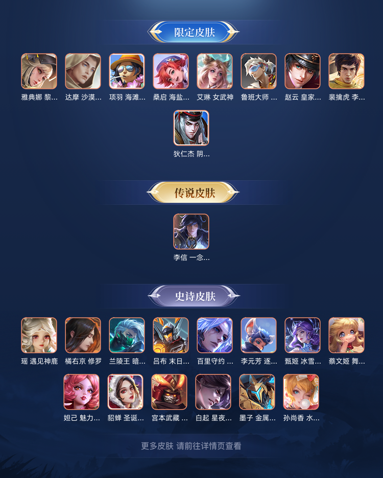 装备描述:小国标李信1.4w 省标后羿 传说皮: 炽阳神光,一念神魔,云中君群星魔术团 限定皮: 李小龙