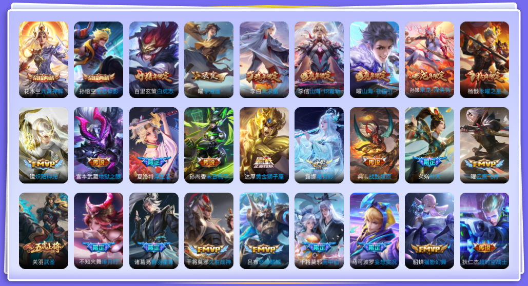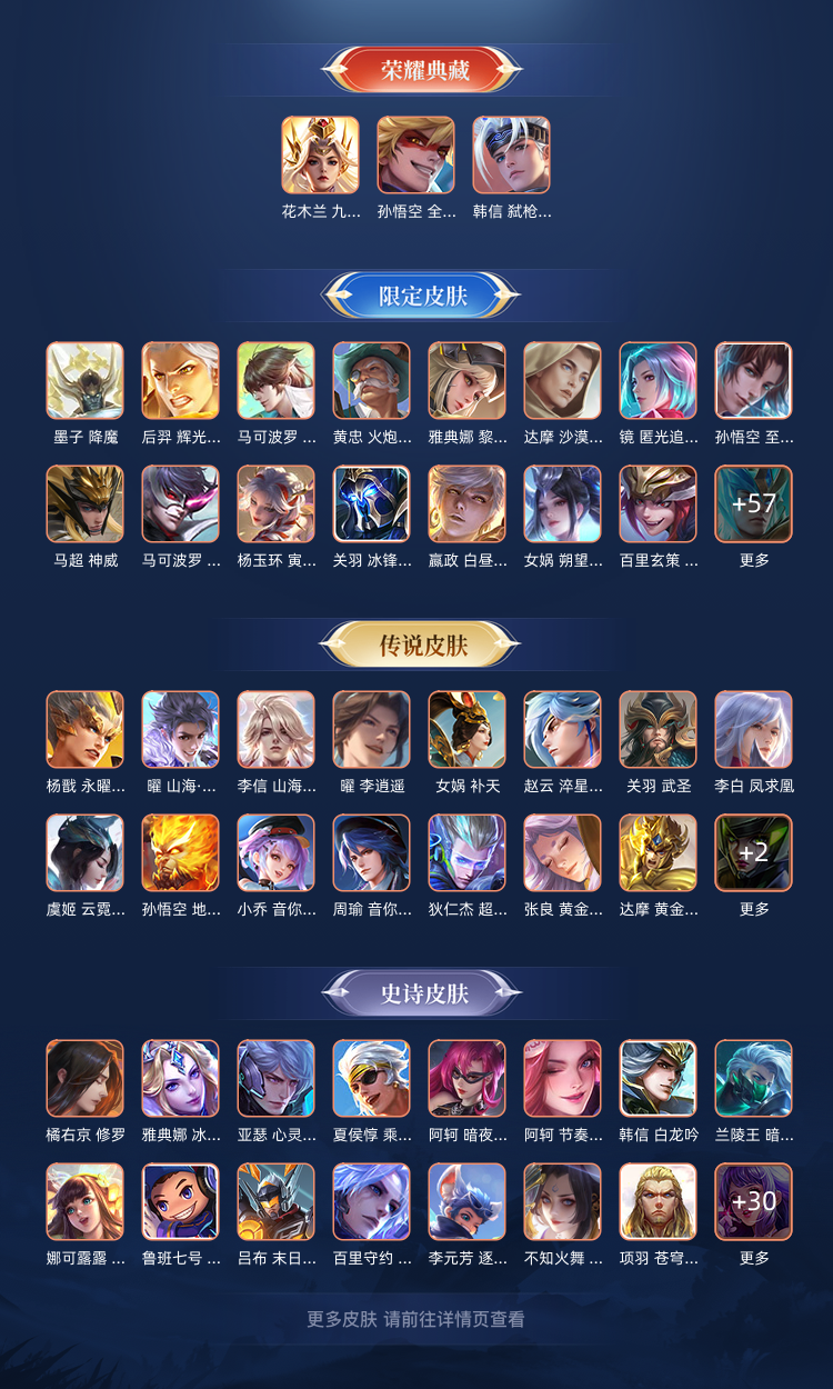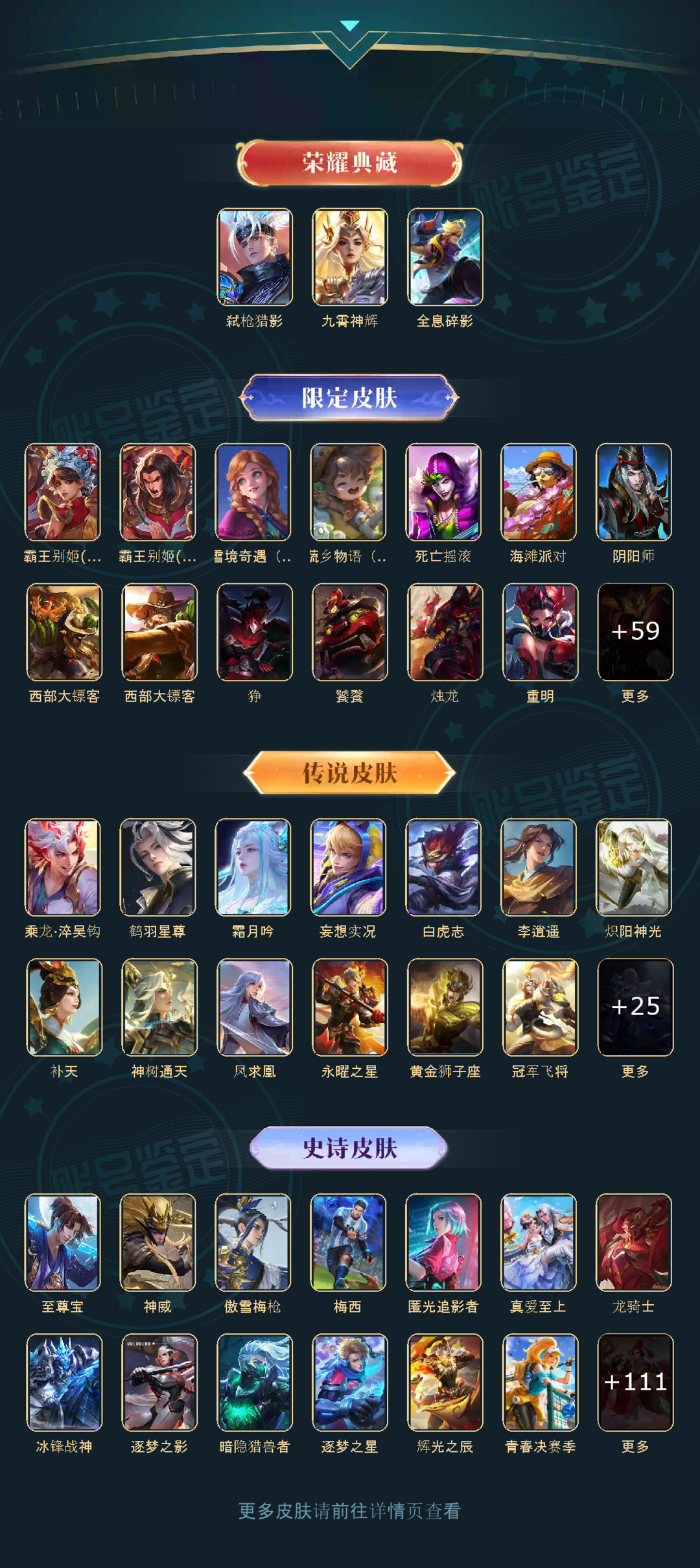 装备描述:贵族等级: V10 英雄数: 127 皮肤数: 424 荣耀水晶: 全息碎影,九霄神辉 传说皮: 黄金狮子座,冠军飞将,云鹰飞将,黄金白羊座,猫影幻舞,久胜战神,炽阳神光,云霓雀翎,末日机甲-孙尚香,地狱火,音你心动-小乔,地狱之眼,音你心动-周瑜,李逍遥,淬星耀世,超时空战士-狄仁杰,碎云,山海·炽霜斩,山海·苍雷引,画中仙,浮生妄,百相守梦(张飞),鹤羽星尊,妄想实况,霜月吟,艾琳觅芳踪,乘龙·淬吴钩,典韦战鼓燎原 限定皮: 冰锋战神,遇见飞天,李小龙,游园惊梦,梁祝,武圣,烈魂,辉光之辰,白晶晶,岱宗,天狼溯光者,神威,蜜橘之夏,永曜之星,青春决赛季,冰霜恋舞曲,逐梦之星,逐梦之影,天狼绘梦者,凤求凰,白虎志,青龙志,瑞麟志,玄武志,朱雀志,梅西,至尊宝,真爱至上,大圣娶亲,霸王别姬-项羽,霸王别姬-虞姬,高山流水,匿光追影者,傲雪梅枪,寅虎·心曲,补天,五谷丰年,绯月行,降魔,怒海麟威,山海·玄木吟