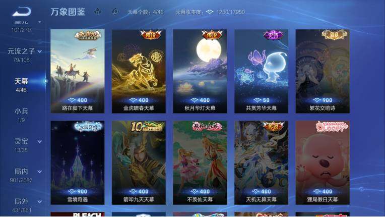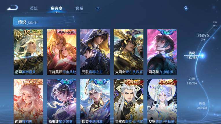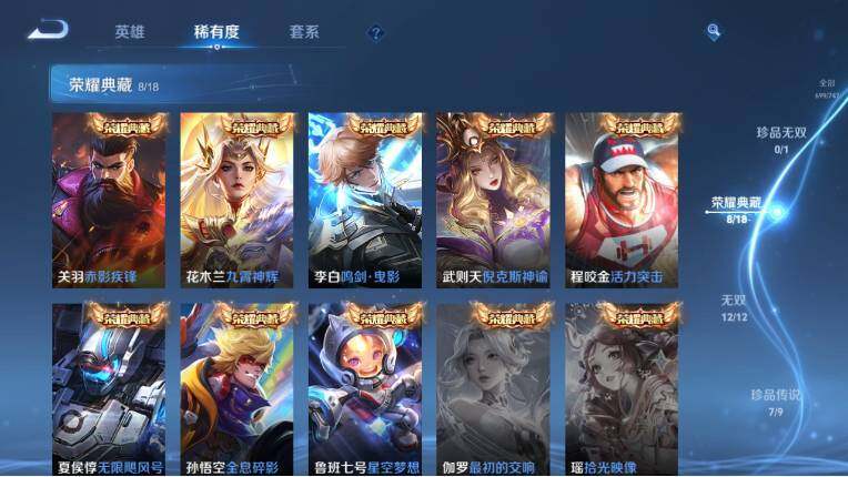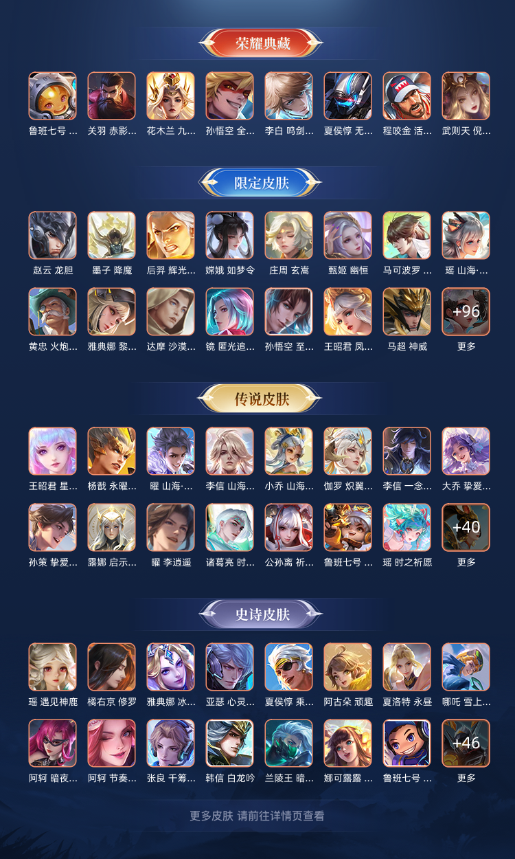 装备描述:【荣耀典藏】:武则天英雄,孙悟空全息碎影,武则天倪克斯神谕,夏侯惇无限飓风号,鲁班七号星空梦想,程咬金活力突击,李白鸣剑曳影,花木兰九霄神辉,关羽赤影疾锋 【无双皮肤】:武则天神器明辉仪,妲己青丘九尾,瑶真我赫兹,李白碎月剑心,小乔时之魔女,韩信群星魔术团,不知火舞花合斗,公孙离离恨烟,甄姬雪境奇遇,曜器灵螭龙剑,诸葛亮天机白泽,铠神罪 【珍品传说】:马可波罗怪盗基德,鲁班七号江户川柯南,孙策时之奇旅,嫦娥器灵落星盏,张飞兔狲蓬尾,瑶大耳狗之梦,安琪拉酷洛米之心 【传说皮肤】:后羿神树通天,干将莫邪千山共赴,元歌诡秘之主,大司命死亡执政官,司马懿九山相柳,西施续相思,杨玉