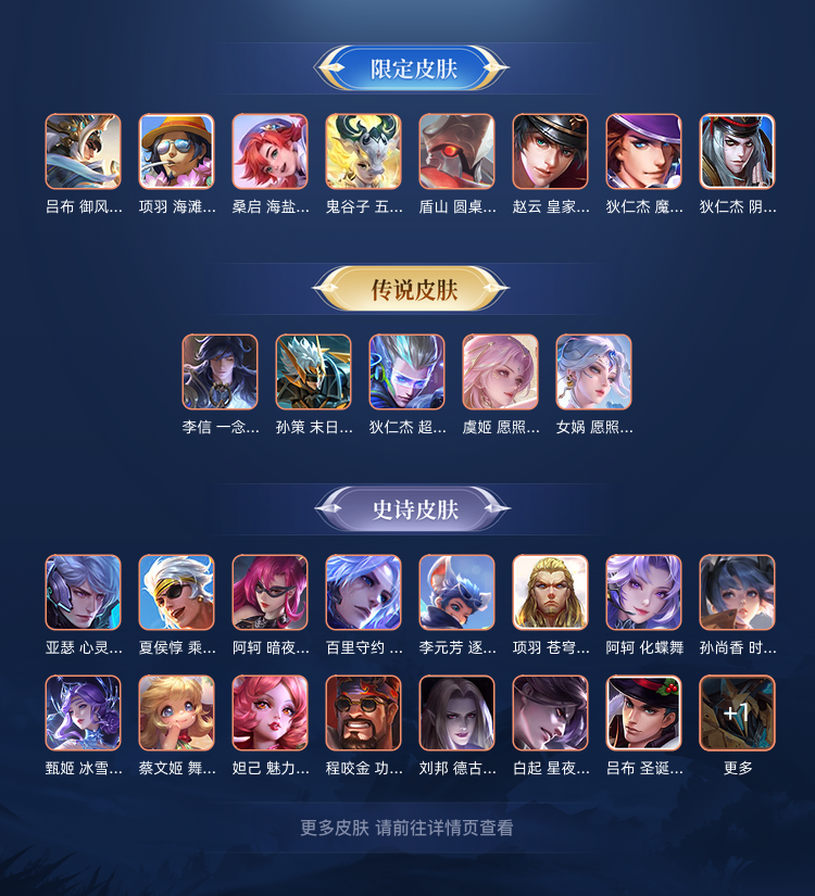 装备描述:皮肤数: 120 传说皮: 一念神魔,超时空战士-狄仁杰,末日机甲-孙策,鹤羽星尊,幻光神枪 限定皮: 御风骁将,五谷丰年,怒海麟威,愿照·千秋盛,愿照·岁时盈
