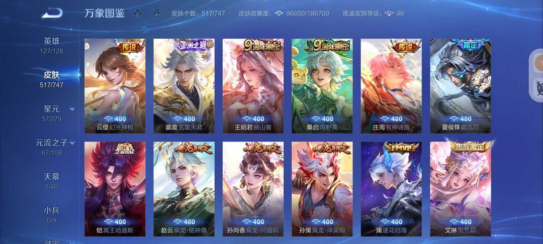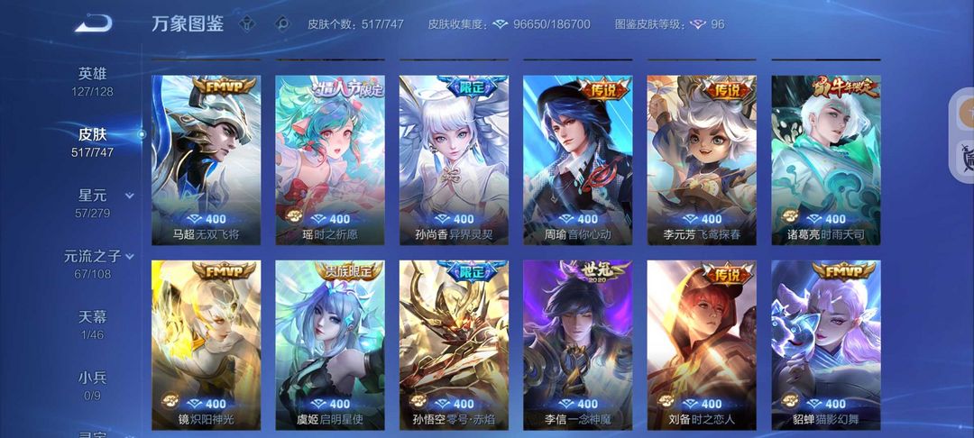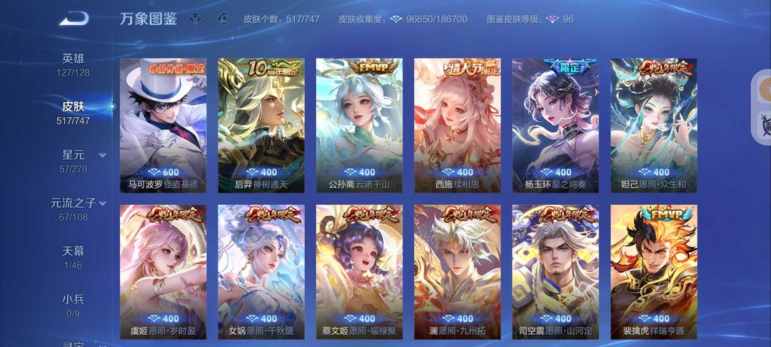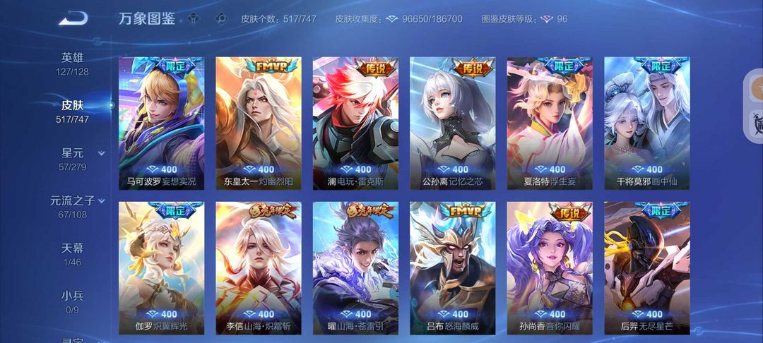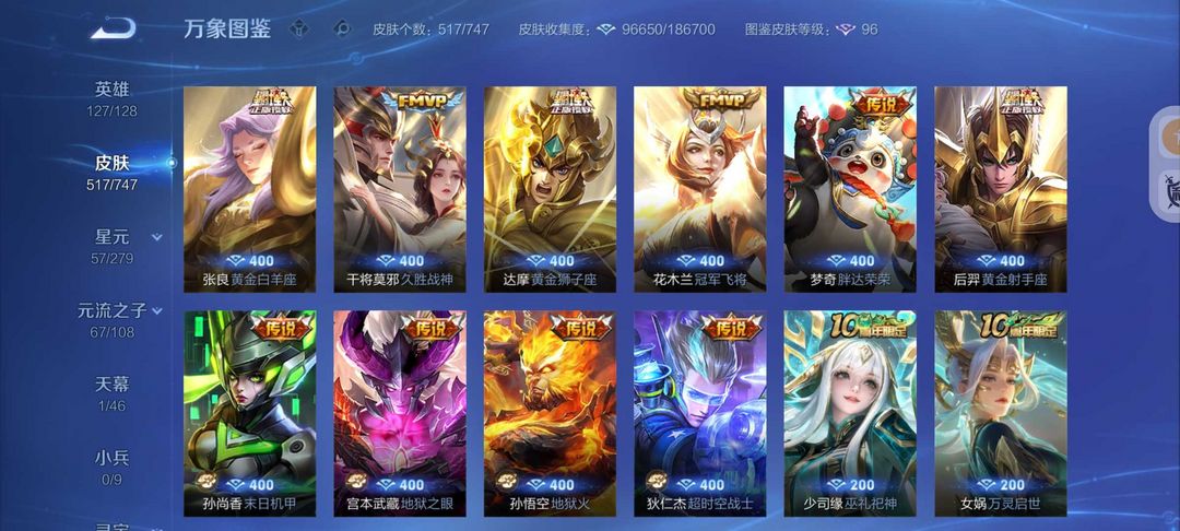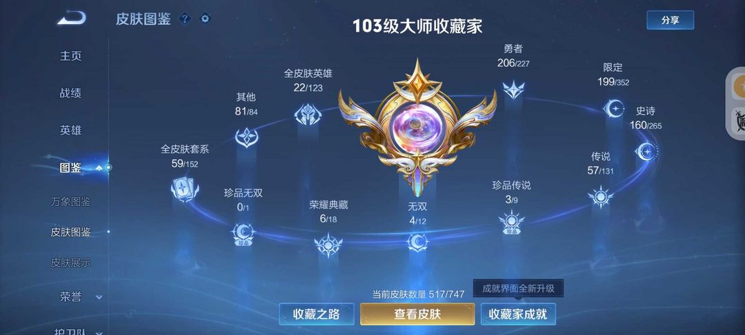 装备描述:517皮肤6水晶4无双皮❤️真我赫兹怪盗基德❤️满蛇年FMVP❤️