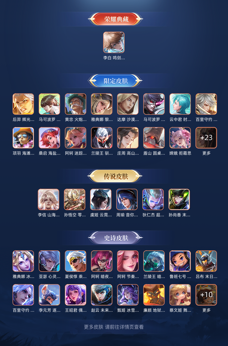 装备描述:云霓雀翎,末日机甲-孙尚香,零号·赤焰,音你心动-周瑜,超时空战士-狄仁杰,山海·炽霜斩 限定皮: 李小龙,梁祝,辉光之辰,朱雀志,高山流水,傲雪梅枪,时之祈愿-云中君,玉兔公主,山海·玄木吟