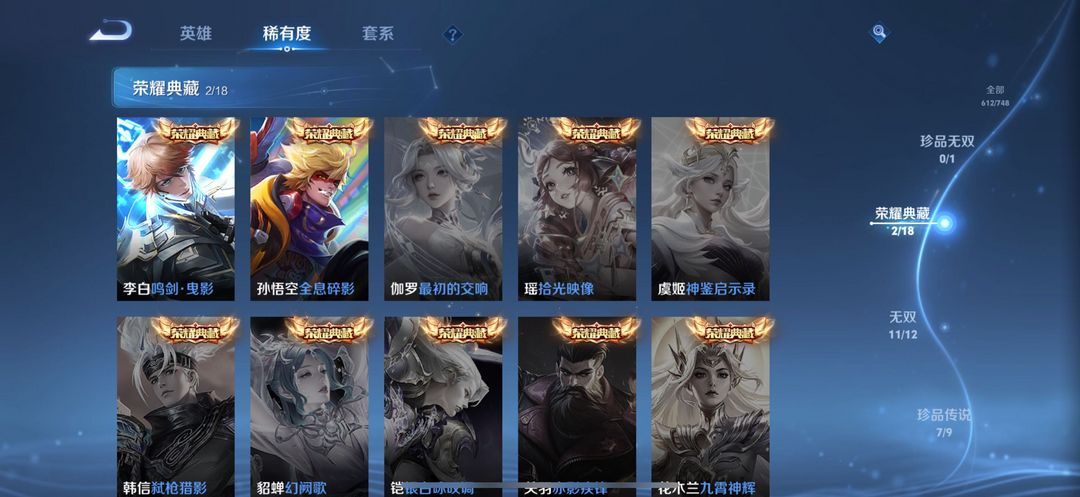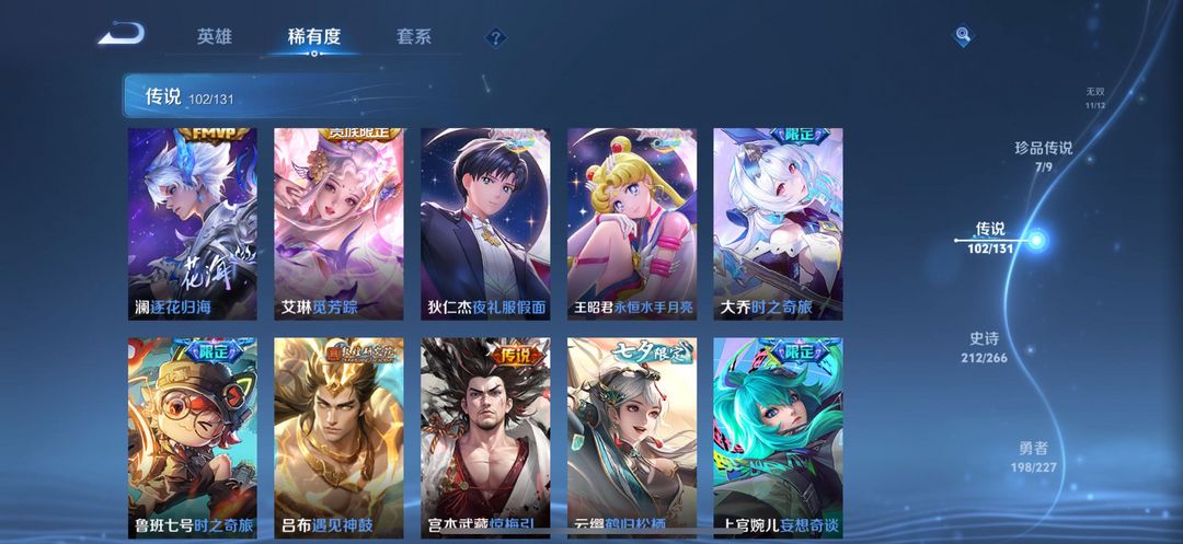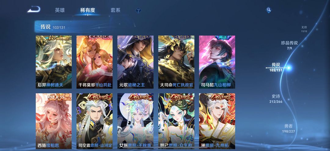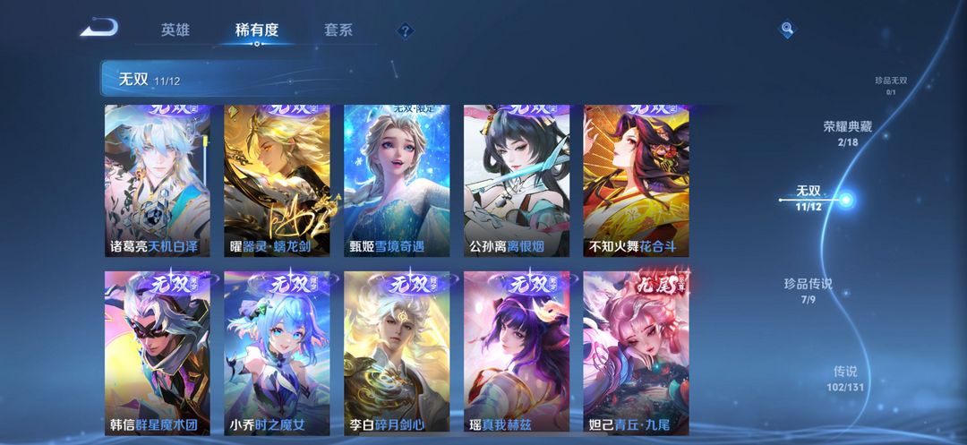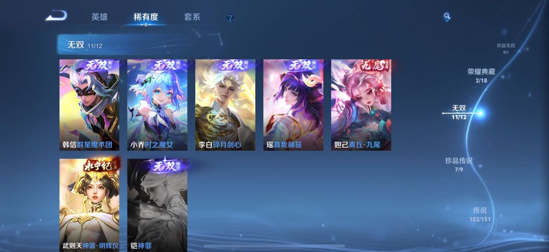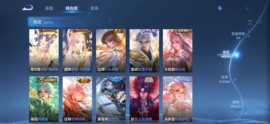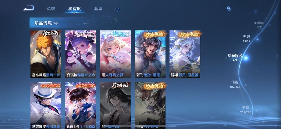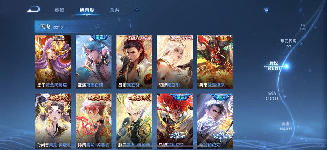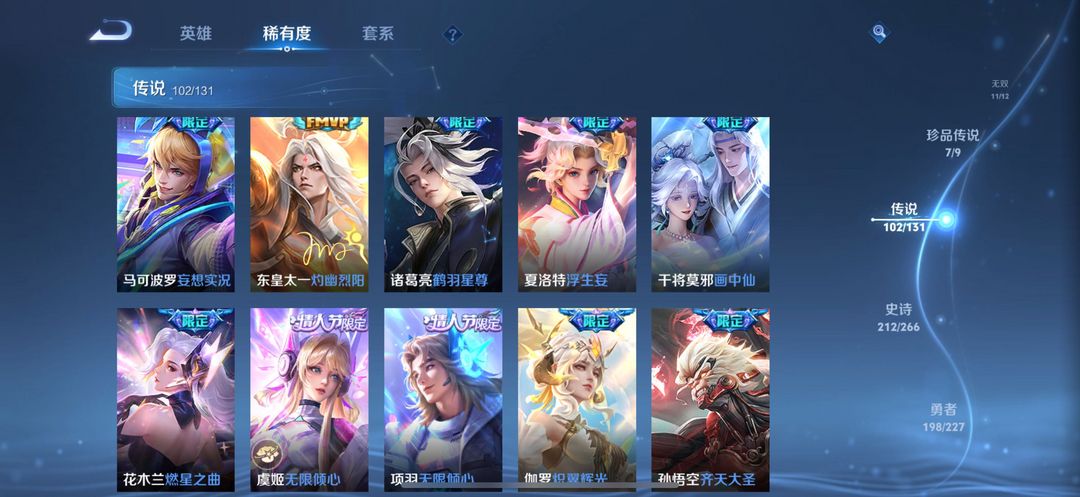 贵族无双V10✨荣耀典藏3无双11珍品传说7✨星传说皮6✨传说102✨史诗210