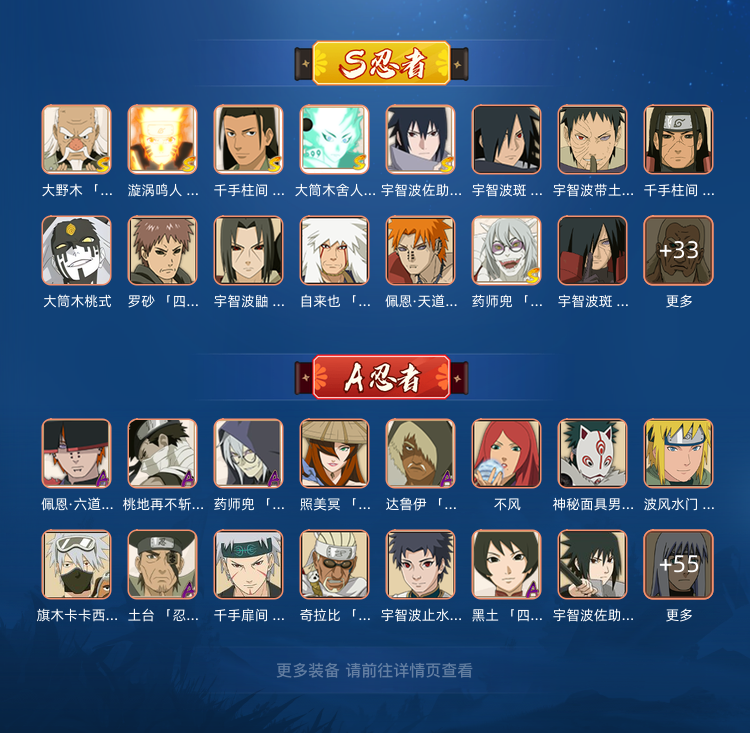 装备描述:41S✨315忍✨秽土柱间✨武士扉间✨天道超✨新春止水✨秽土鼬✨大野木✨白面具✨秽土斑✨须佐佐助✨蜀面自来也 提示●游戏新机制:上号时上个租客还在线会直接显示在别处登陆,重新登录顶掉就行,我是不会恶意顶号