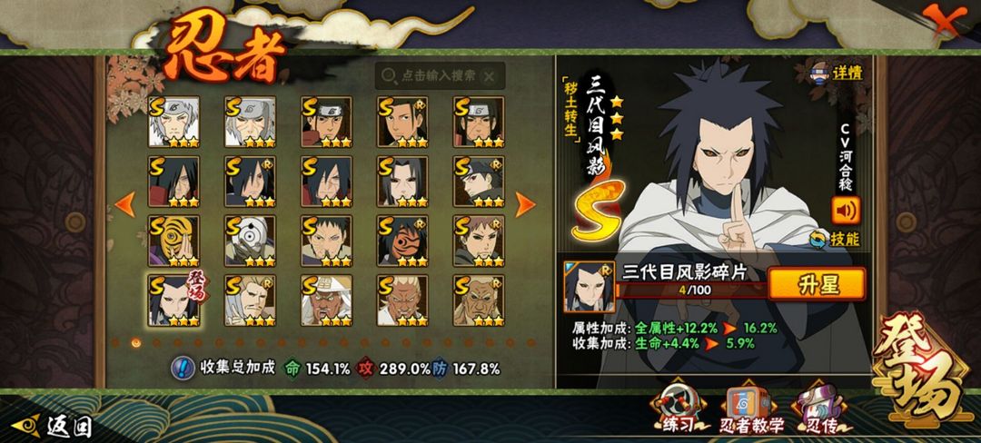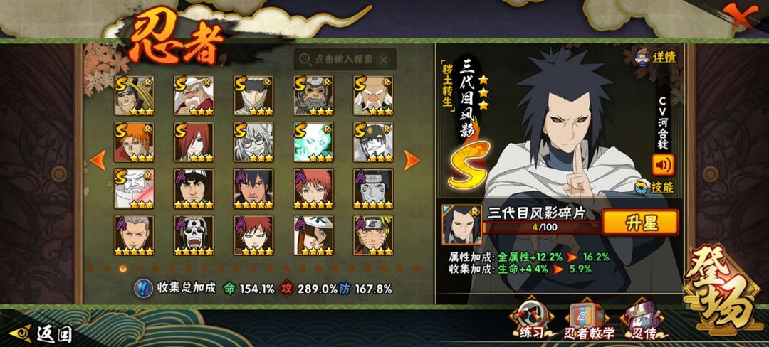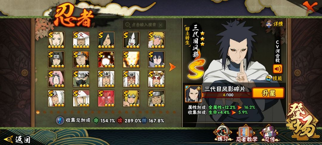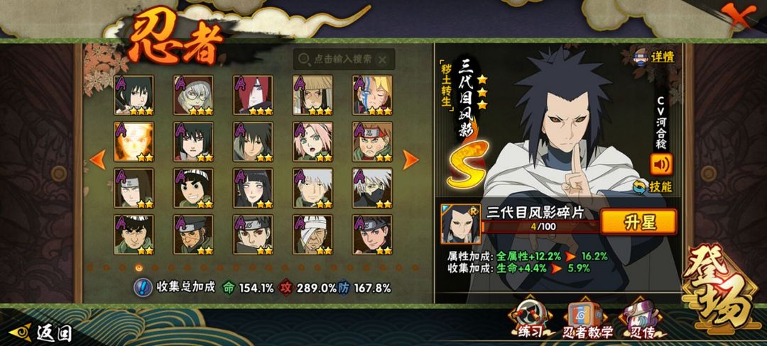 装备描述:47S忍 ✨秽土水门✨白面具✨三代猿飞日斩✨秽土鼬✨秽土斑✨自来也✨大蛇丸✨四代雷影艾✨二代千手扉间✨三代雷影艾✨百豪纲手✨千手柱间初代✨金角银角✨须佐鼬✨纲手✨秽土二代✨鬼灯幻月✨斑✨豪杰自来也✨秽土三代