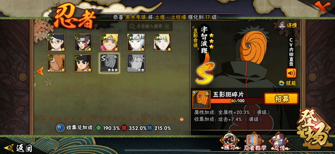 全忍者408个忍者暴怒六尾已出已出漂泊带土已出准全忍者高战3370万战力充值3.2W全通灵各种