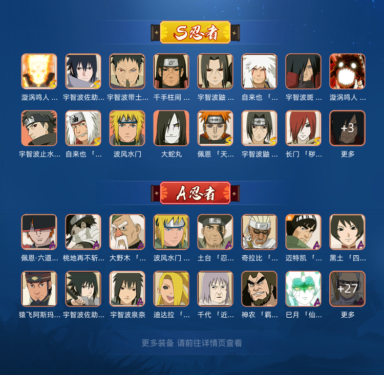 20S,侠佐,妖纲已出,六尾,黄猿,紫狗,绿牛,解斑,死柱,秽土鼬,须佐卡卡西,漂带,漂佩
