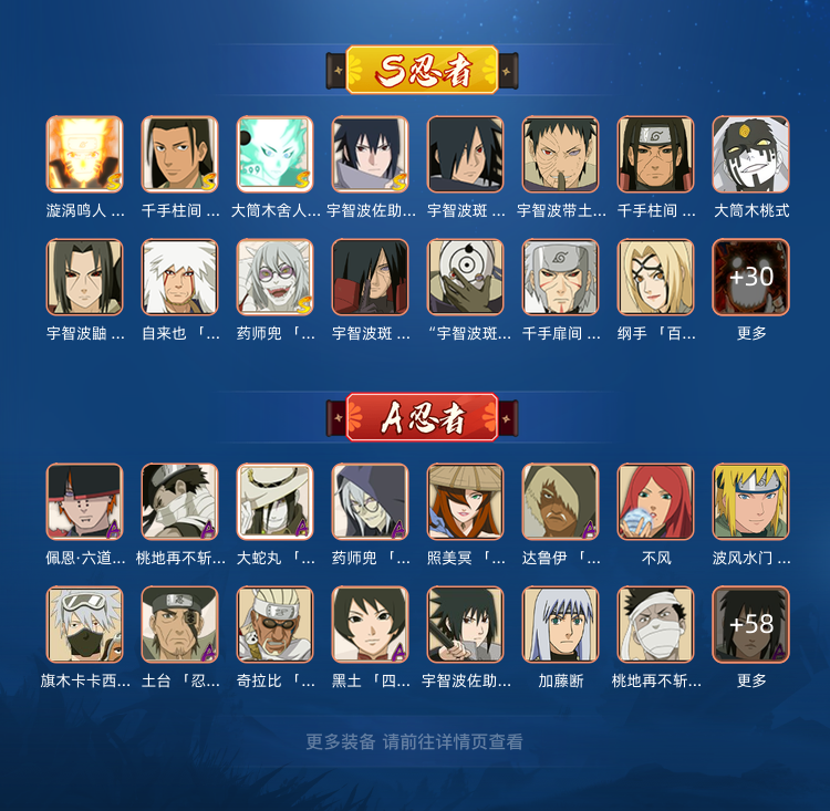 装备描述:✨九尾水门已秒✨五影斑✨漂泊带土✨46s多点券A近全忍者