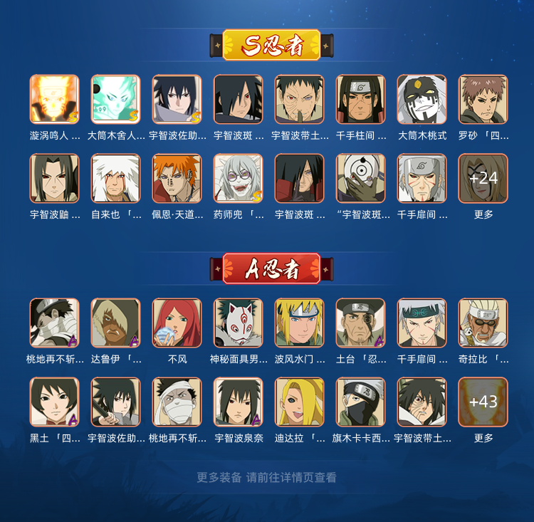 限制: 撤单率<40%才可租用此帐号装备描述:S忍者:漩涡鸣人 「九喇嘛连结」;长门 「秽土转生」;自来也 「舞之豪杰」;宇智波鼬 「秽土转生」;迈特凯 「死门」;波风水门;大筒木桃式;宇智波鼬 「须佐能乎」;猿飞日斩;神秘面具男;自来也 「传说中的三忍」;大筒木金式;宇智波止水 「须佐能乎」;纲手;大筒木舍人 「最终章」;千手柱间;神秘面具男 「红夜之刃」;波风水门 「秽土转生」;猿飞日斩 「秽土转生」;佩恩 「天道」;千手柱间 「秽土转生」;“宇智波斑” 「白面具」;大蛇丸;宇智波斑 「秽土转生」;旗木卡卡西 「须佐能乎」;宇智波斑;纲手 「百豪」;千手扉间 「秽土转生」;药师兜 「仙人模式」;自来也;无 「二代目土影」;宇智波斑 「秽土转生·解」;宇智波佐助 「永恒万花筒」;春野樱 「忍界大战」;宇智波带土 「忍界大战」;漩涡鸣人 「暴怒·第六尾」;佩恩·天道 「超」;罗砂 「四代目风影」;宇智波斑 「木叶创立」;艾 「忍界大战」 A忍者:绝;土台 「忍界大战」;角都;春野樱 「百豪」;小南;桃地再不斩 「漂泊武士」;漩涡鸣人 「仙人模式」;迪达拉;漩涡博人 「桃式显现」;桃地再不斩;奇拉比 「忍界大战」;长门 「青年」