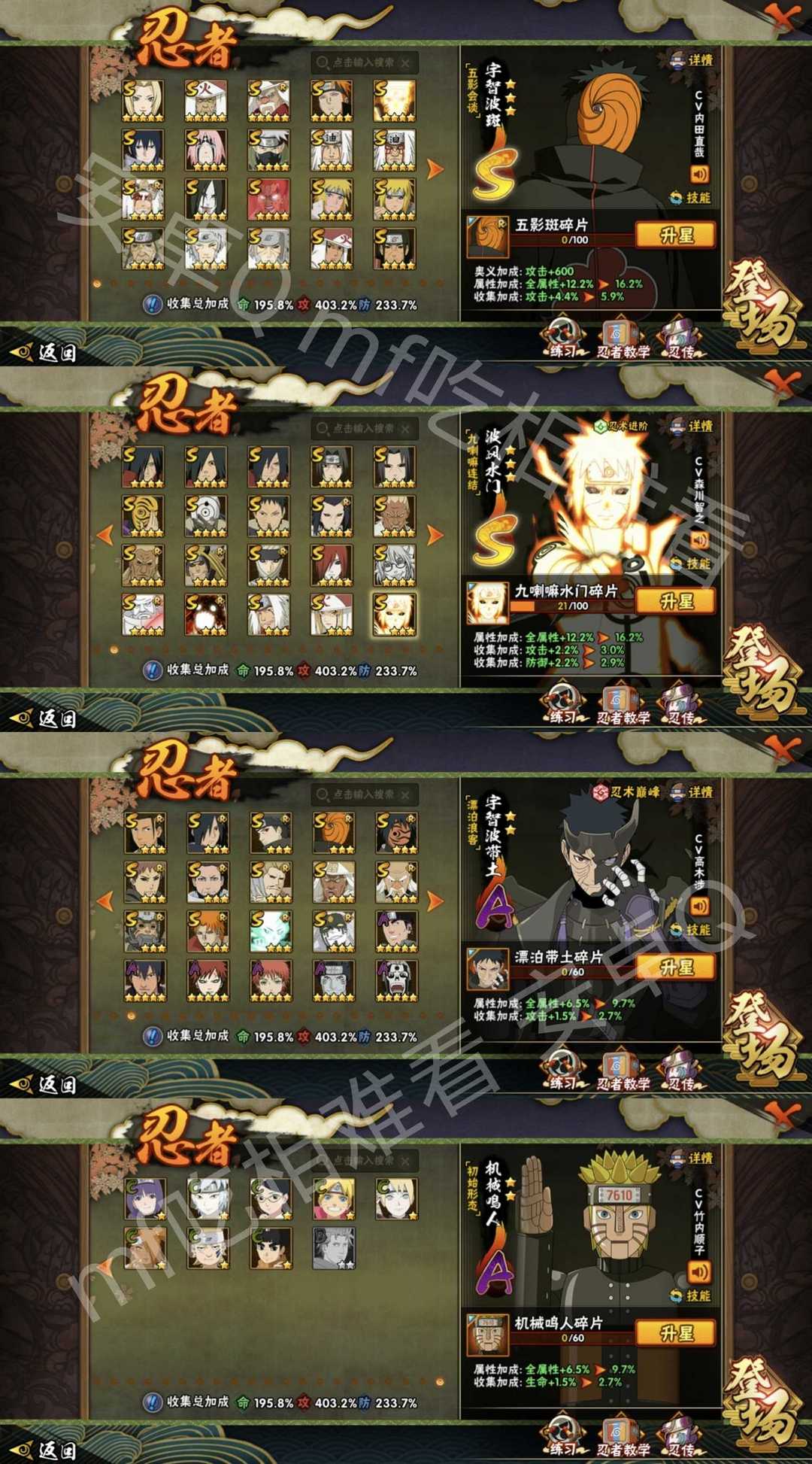 五影会谈斑·金身水门·漂带❤80级魅力·满配4100万❤全忍者通灵·全场景入场时装❤超多648奥义
