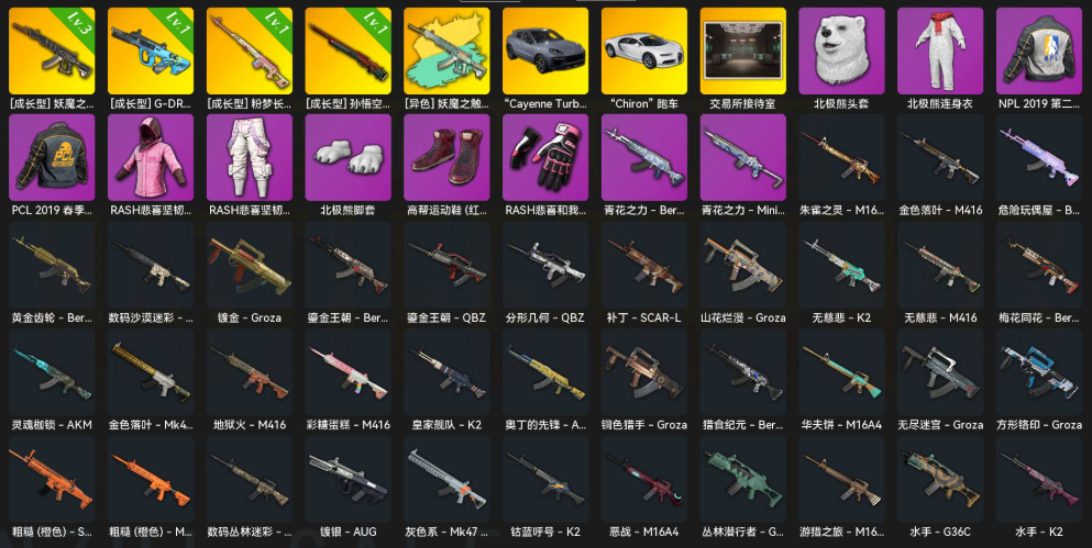 异色妖魔之触√布加迪跑车蓝色漆√保时捷跑车√4神器√权志龙AUG√悟空M24√新娘头√柏林鞋√白熊爪