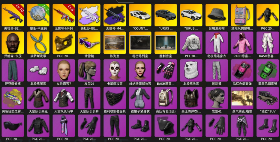 装备描述:双大厅/满兰博基尼/满级异色美杜莎M762/六级异色无信号M416/无重力MP5K/塞壬平底锅/熊脚/玩偶电磁包/发光套/黑鬼/滑雪镜/染血库/彩烟/烟枪/小黄鸭套装/拉风龙套装/霓虹军团套