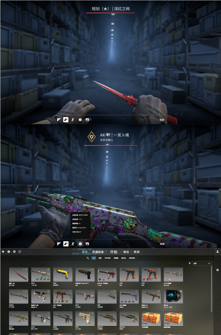 装备描述:完美老兵可5e丶深红之网短剑丶崭新ak47一发入魂丶m4都市丶awp毛细血管丶沙漠之鹰轻轨丶主战皮肤齐全