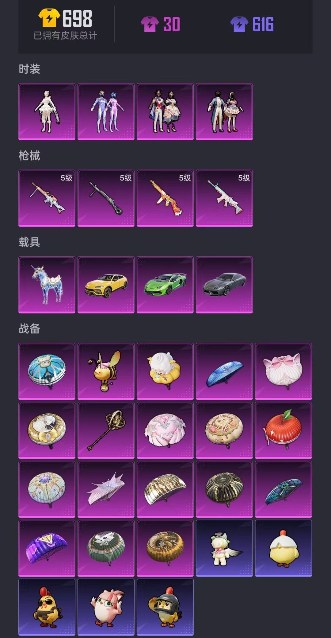 限制: 撤单率<49%才可租用此帐号装备描述:禁止开挂,禁止坐挂车,禁止骂人,禁止分解枪械等~谢谢宝宝们~ 套装148个,粉套4个, 枪皮179个,特效枪4个 载具皮肤4个 装备219个,三级头31个,三级包28个 滑翔尾迹8个,伙伴5个,降落伞66个 祝您游戏愉快~