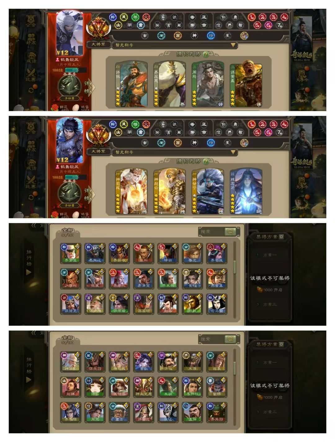 限制: 撤单率<19%才可租用此帐号装备描述:官方三等大将军,有卡,VIP12! 5五星炎龙:动神赵云动戏志才,杜预界徐盛! 8四星玉龙:动神荀彧动界左慈动许攸,南华老仙! 50史诗武将,动神甘宁动界钟会动界李儒动诸葛瞻动谋马超,金谋黄盖金司马昭,谋关羽神华佗谋黄忠王元姬神太史慈周处等! 35动皮75金皮170国战皮肤!