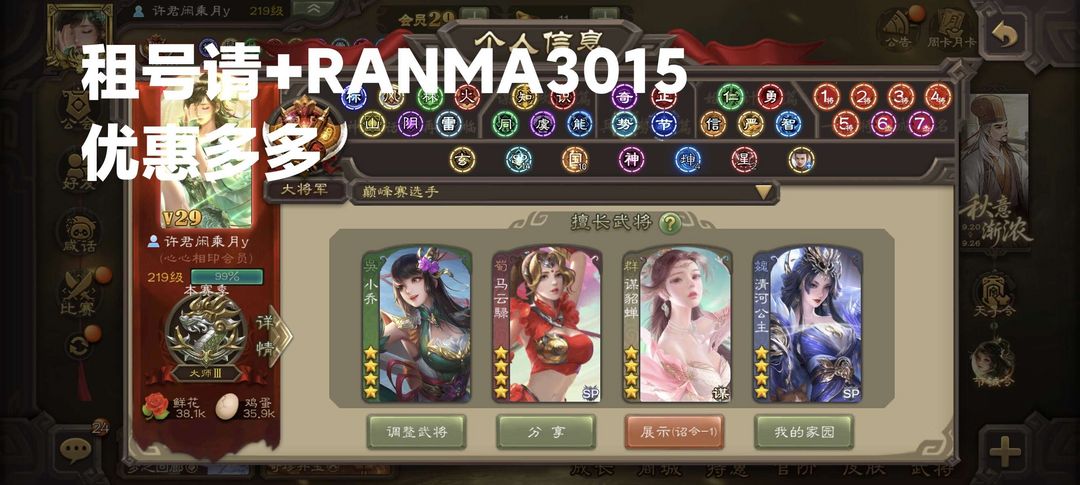 装备描述:☞真全扩一等大将军,所有史诗一个不差精品齐全,热门回廊齐全。330+动态皮肤,排名40.海量三卡。 ★时间到了接着玩不顶号★ 文明游戏,禁止逃跑 租号可➕∨ 绿paopao,【RANMA3015】有福利