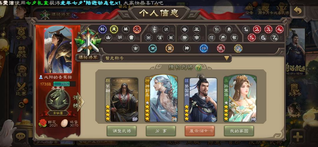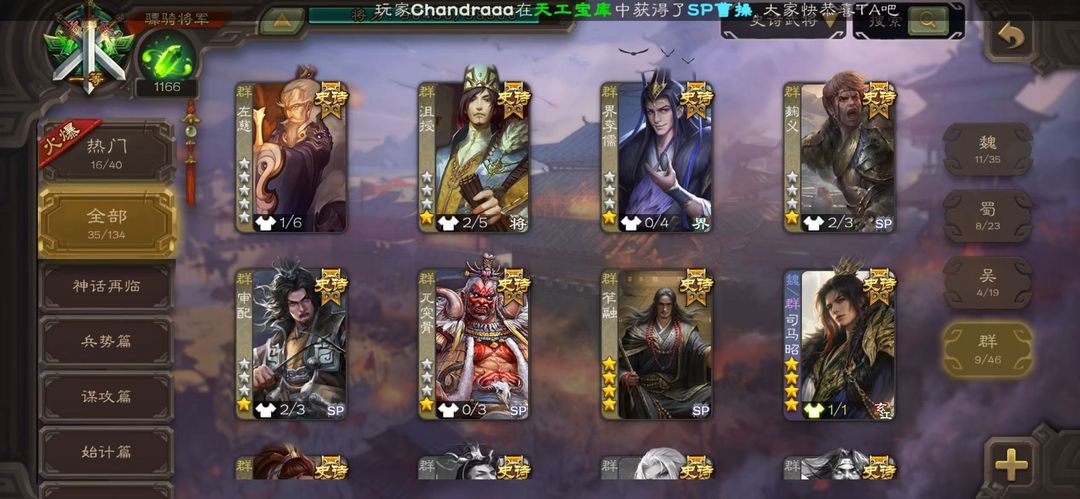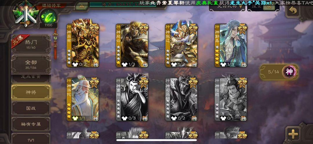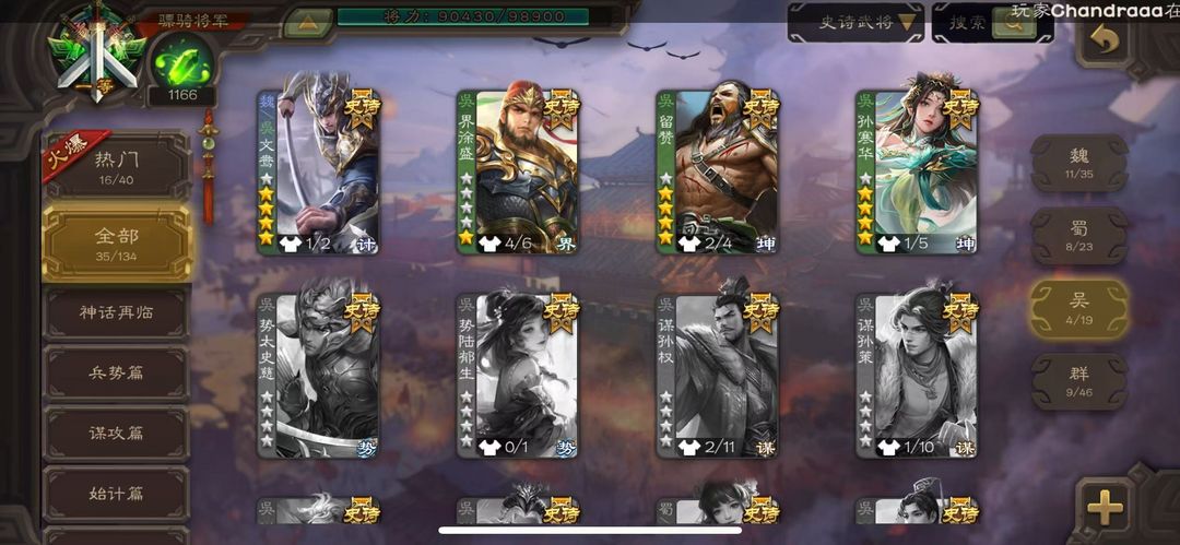 装备描述:[有卡】势国渊,动神郭嘉,笮融,动孙寒华,回廊文鸯,回廊神华佗,动司马昭,动谋关羽,回廊动大宝,回廊麹义,阎象,友徐庶,动神赵云,神吕布,戏志才,界钟会
